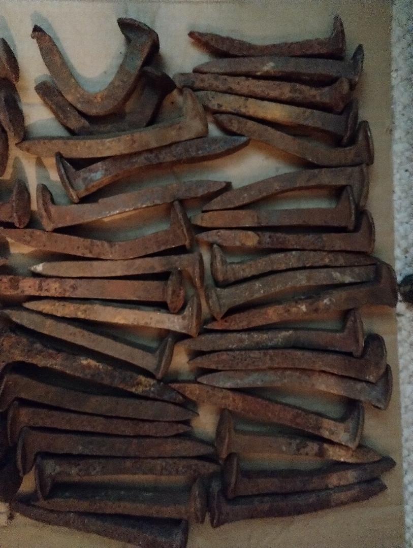 These are older spikes in fair to poor condition, most bent some and a number much corroded but some are not so awful and we are charging twenty cents each whereas some want two dollars each. Most are probably medium carbon. The indication for such would be stamped on top and I don't know that you could possibly read any of them. I do not however believe the lines these came from used any High Carbon spikes until more recently, and neither do you tend to ever find one of those bent up. If you are looking for bulk spikes to make some farm repairs or turn out little horseshoes to sell at County Fairs these are what you want. You will have to scale off some rust but the iron is easier to work. If you need even more we probably have another box but we only take these to keep from stopping and looking at them again in the future so they do amount to something of a by-product.