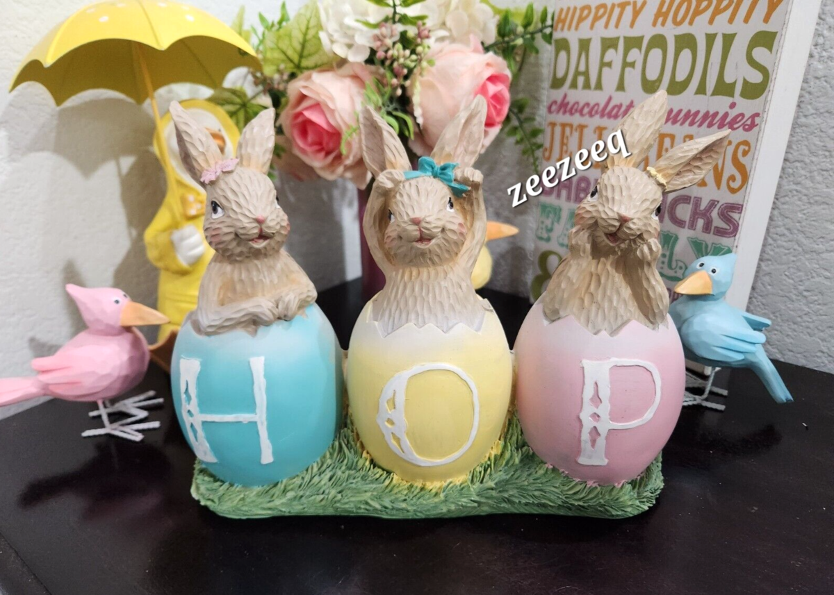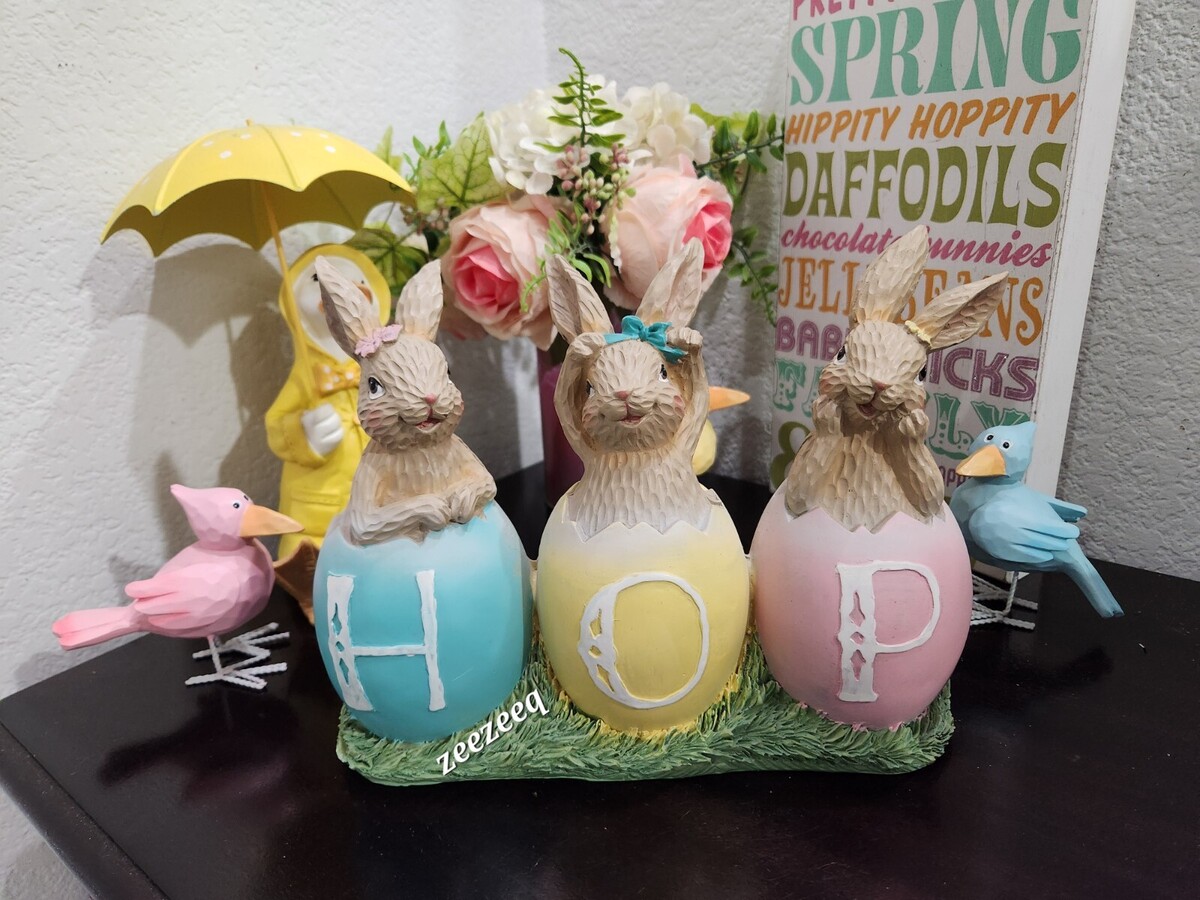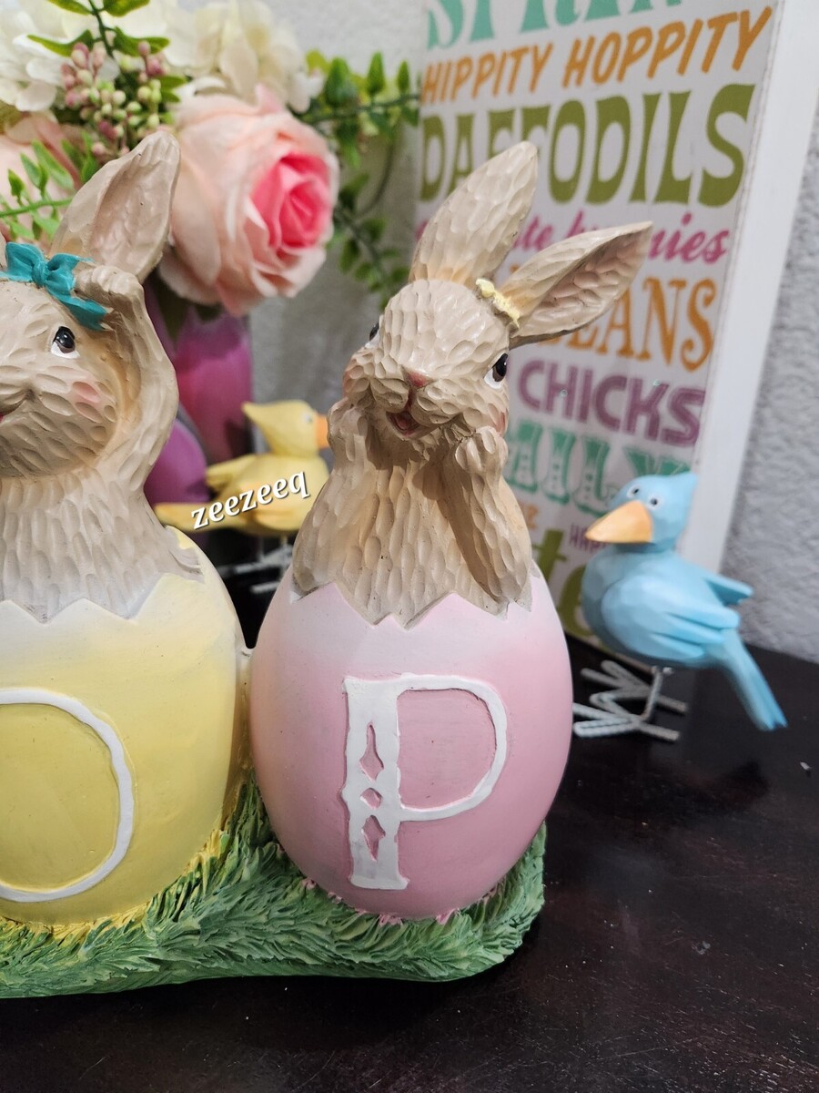 Up for sale are these adorable little bunnies coming out of a egg shell. Each egg has a letter that spells HOP. Made of resin there are approx 8.25" tall x 10" wide.