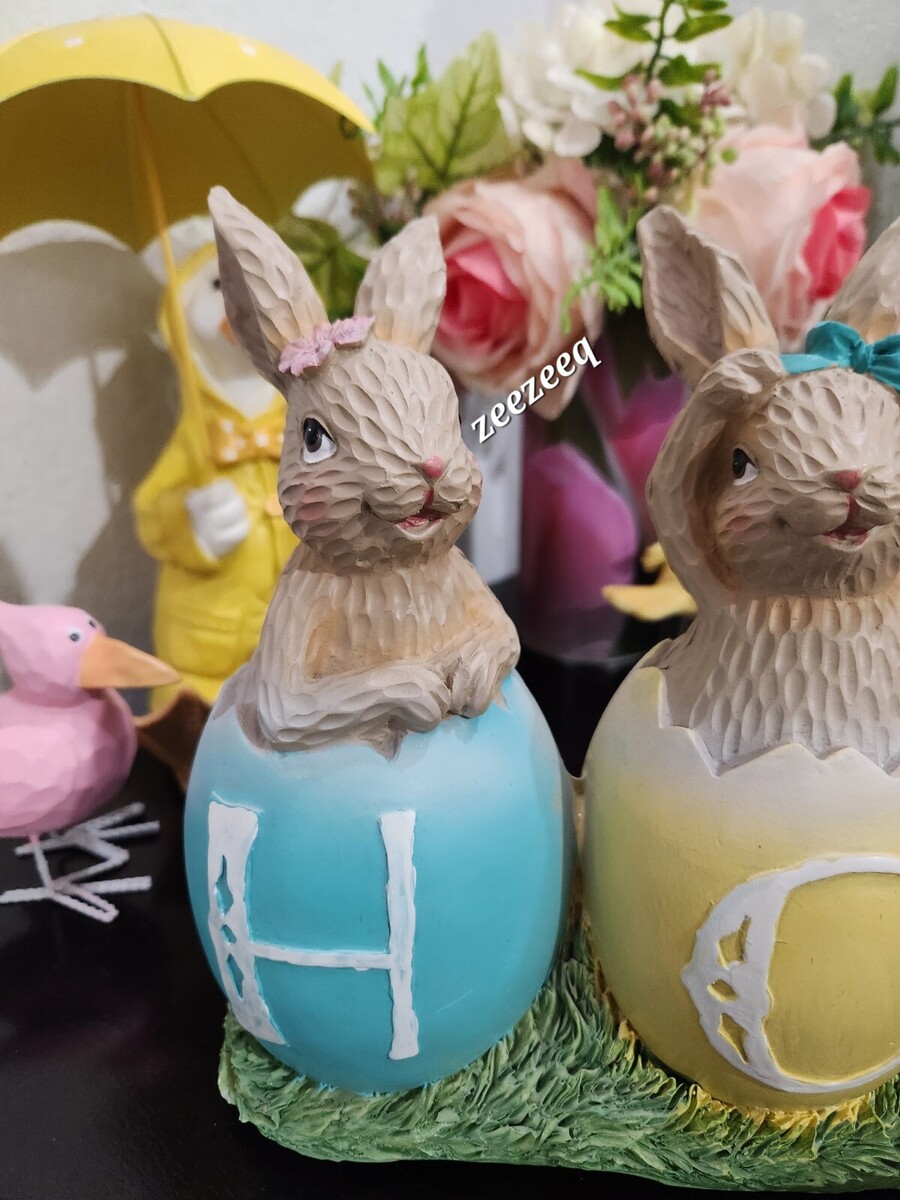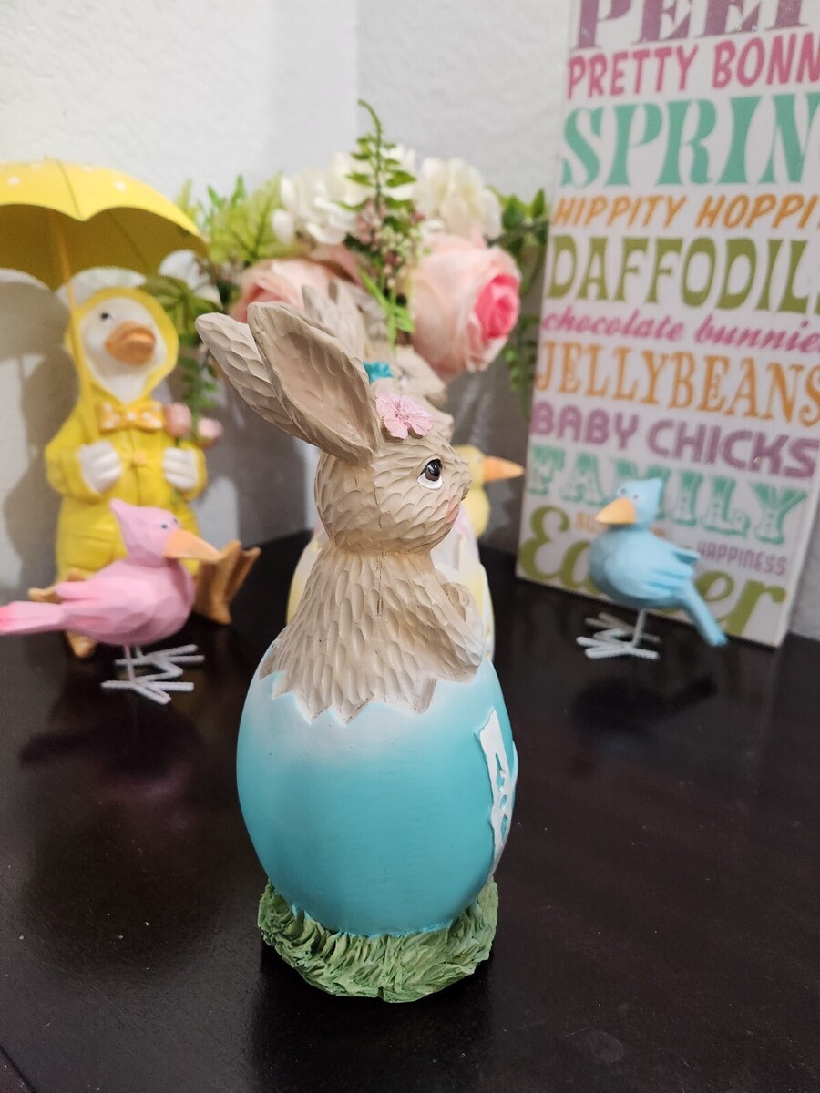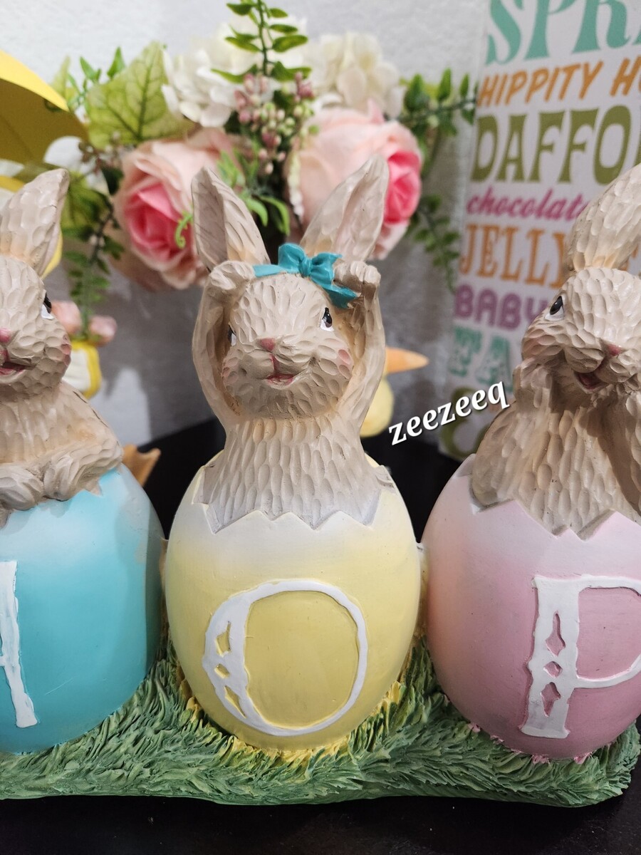 Up for sale are these adorable little bunnies coming out of a egg shell. Each egg has a letter that spells HOP. Made of resin there are approx 8.25" tall x 10" wide.