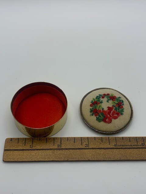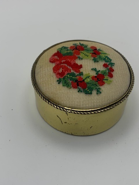 Cute Cross Stitch Wreath Pin Cushion Trinket Box Some scuffs as shown on metal finish. Please refer to images.