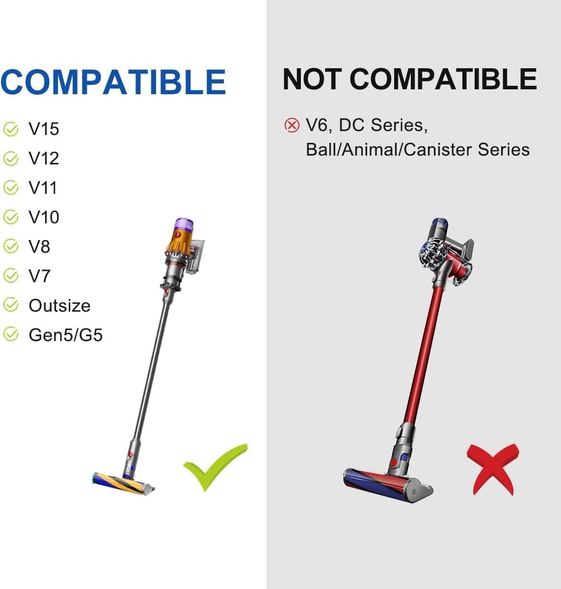 This crevice tool with nozzle is compatible with V15 V12 V11 V10 V9 V8 V7 Gen5 G5 Outsize Cordless Vacuum (Notice: Not fit V6, DC series, and ball/canister/animal models)