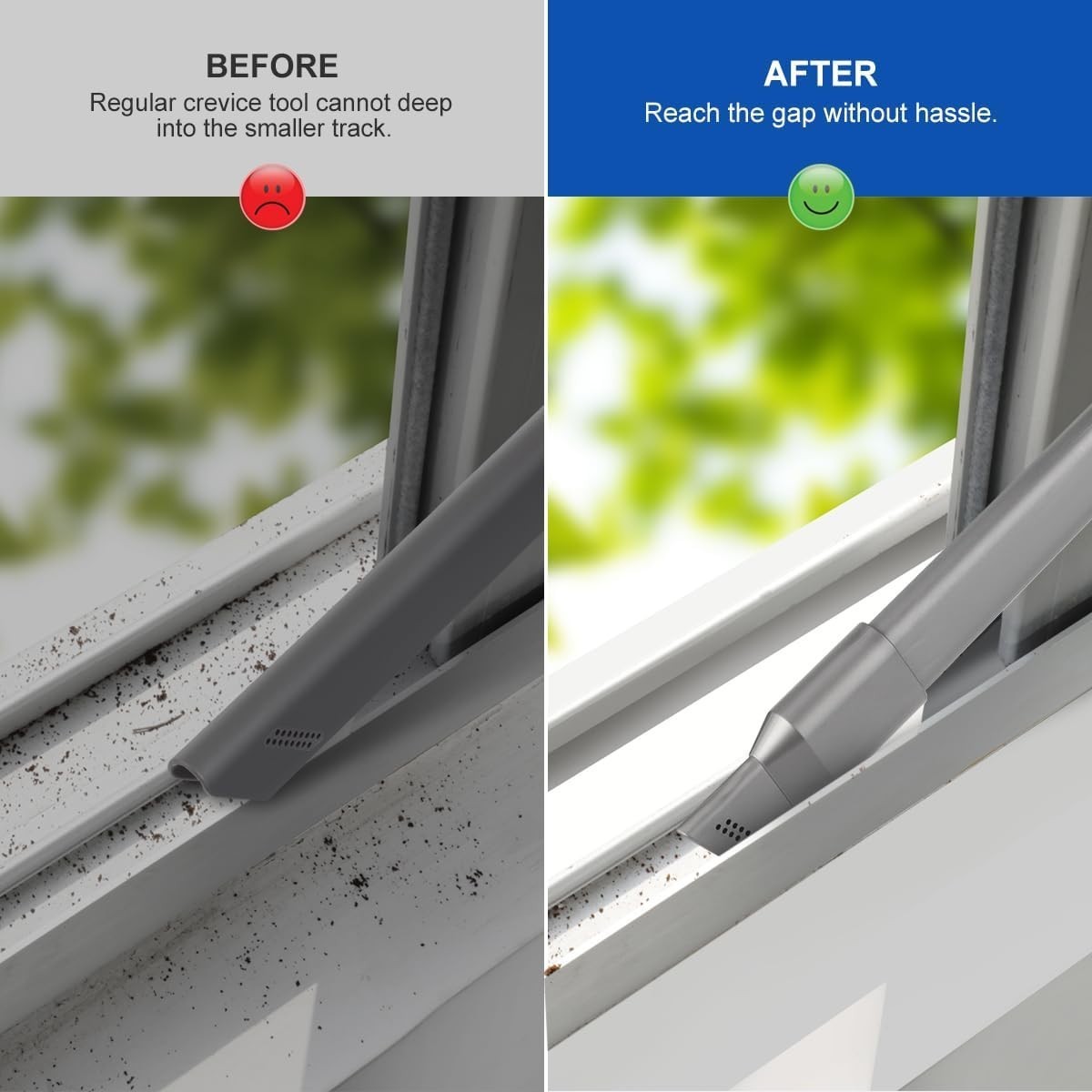 : Our innovative narrower nozzle combines with a crevice tool boasts a slender profile, allowing it to effortlessly navigate into narrow spaces, corners. No more dust hiding in hard-to-reach spots