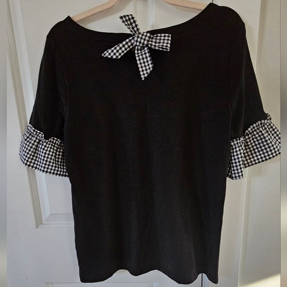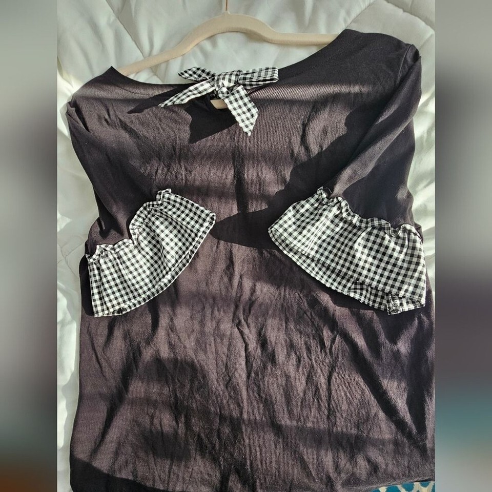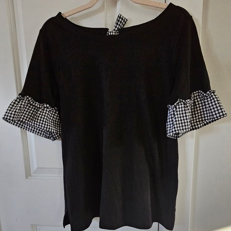 Stylish black Pima cotton top featuring gingham ruffle sleeves and back tie.