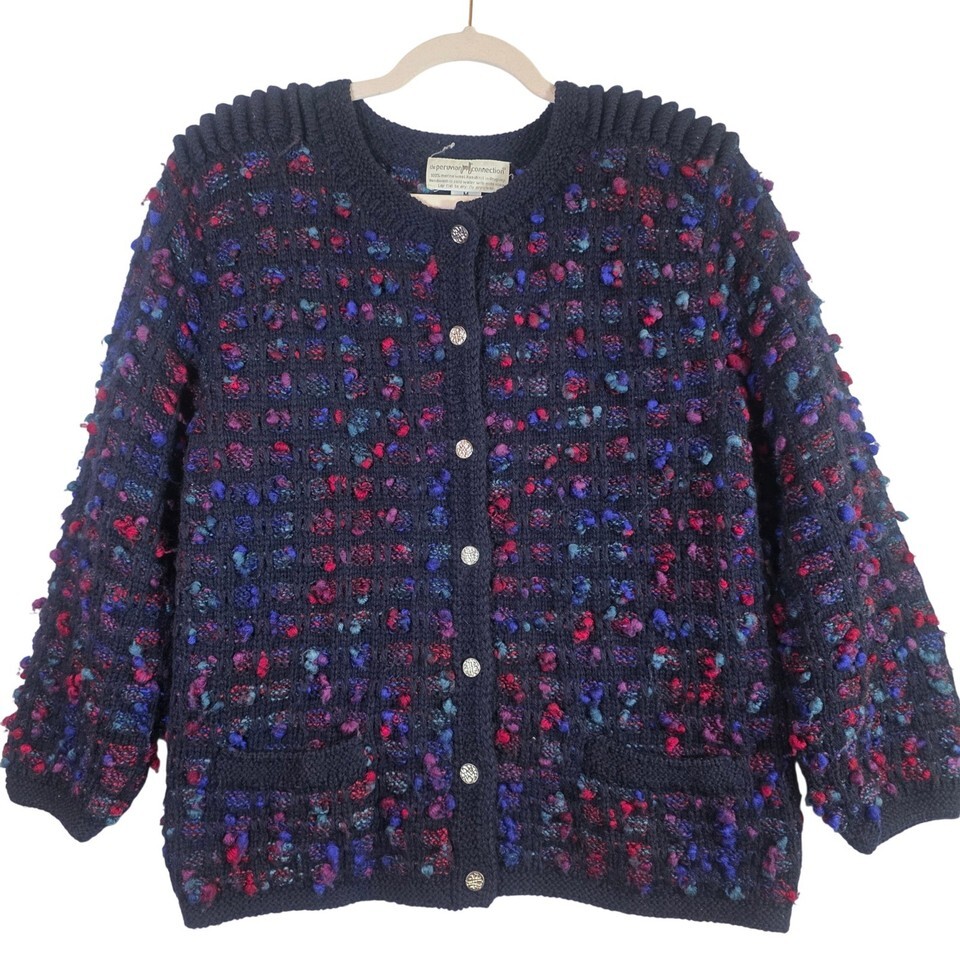 PERUVIAN CONNECTION Vintage Women's M Navy Merino Wool Chunky Knit Cardigan Boho
