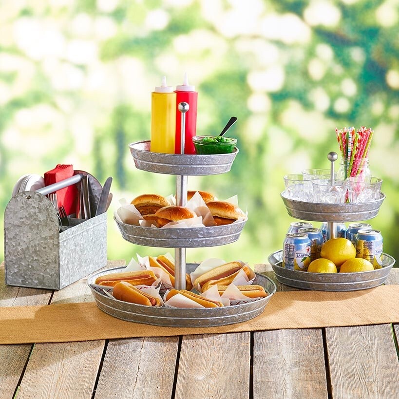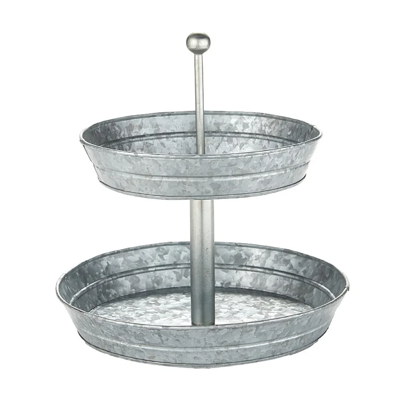 Bring your gatherings to life with the versatile 2 Tier Galvanized Metal Serving tray. Whether it?s an alfresco brunch on the patio or an evening dinner party indoors, this blends style with functionality for seamless entertaining. The 2-Tier Serving Tray artfully showcases appetizers, desserts, or summer serving pieces while saving space. Set out appetizers, desserts and more on this Galvanized Serving Tray. The 2-Tier Serving Tray has graduated levels to create an organized, appealing display. Dowel in the center holds the tiers together. Also makes useful storage for your craft supplies or order several for your wedding. Great for indoor or outdoor table settings.