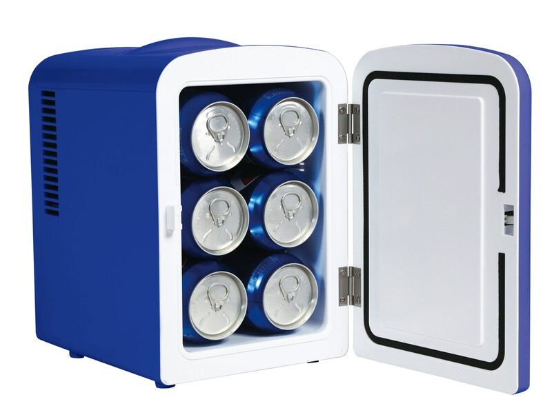 Bud light mini fridge store snacks, beverages, and skin care products Fits easily on your desk, bookshelf or other handy spot Holds 6 cans or 4 liters/0.14 cu ft. capacity Dependable thermoelectric cooling; quiet and vibration free Cools 27-36 degrees Fahrenheit below ambient room temperature Ideal for dorms, drivers, cubicles, nurseries, or anywhere simple drink storage is needed Low noise motor works quietly Economical design consumes much less power than a traditional refrigerator; please allow 2 hours to reach optimal temperature Plugs into a 12V car adapter or home outlet, both cords are included Color: blue