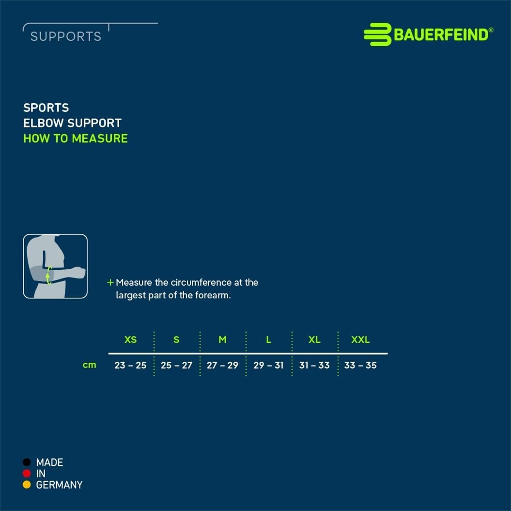 ELBOW SUPPORT DURING SPORTING ACTIVITIES: The Sports Elbow Support supports the movement of the elbow during sporting activities through gentle, beneficial compression. The elbow support surrounds the upper arm and forearm.