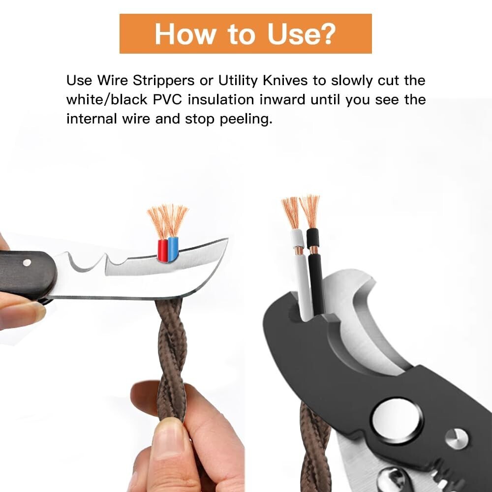 ? Easy Operation ? Use wire strippers or utility knives to slowly cut the PVC insulation inward until you see the internal wire and stop peeling. Please see the fifth stripping pictures. It would be an ideal choice for your DIY lighting projects and fit various scenarios well with its vintage style such as restaurants, parties, homes, bars, etc.