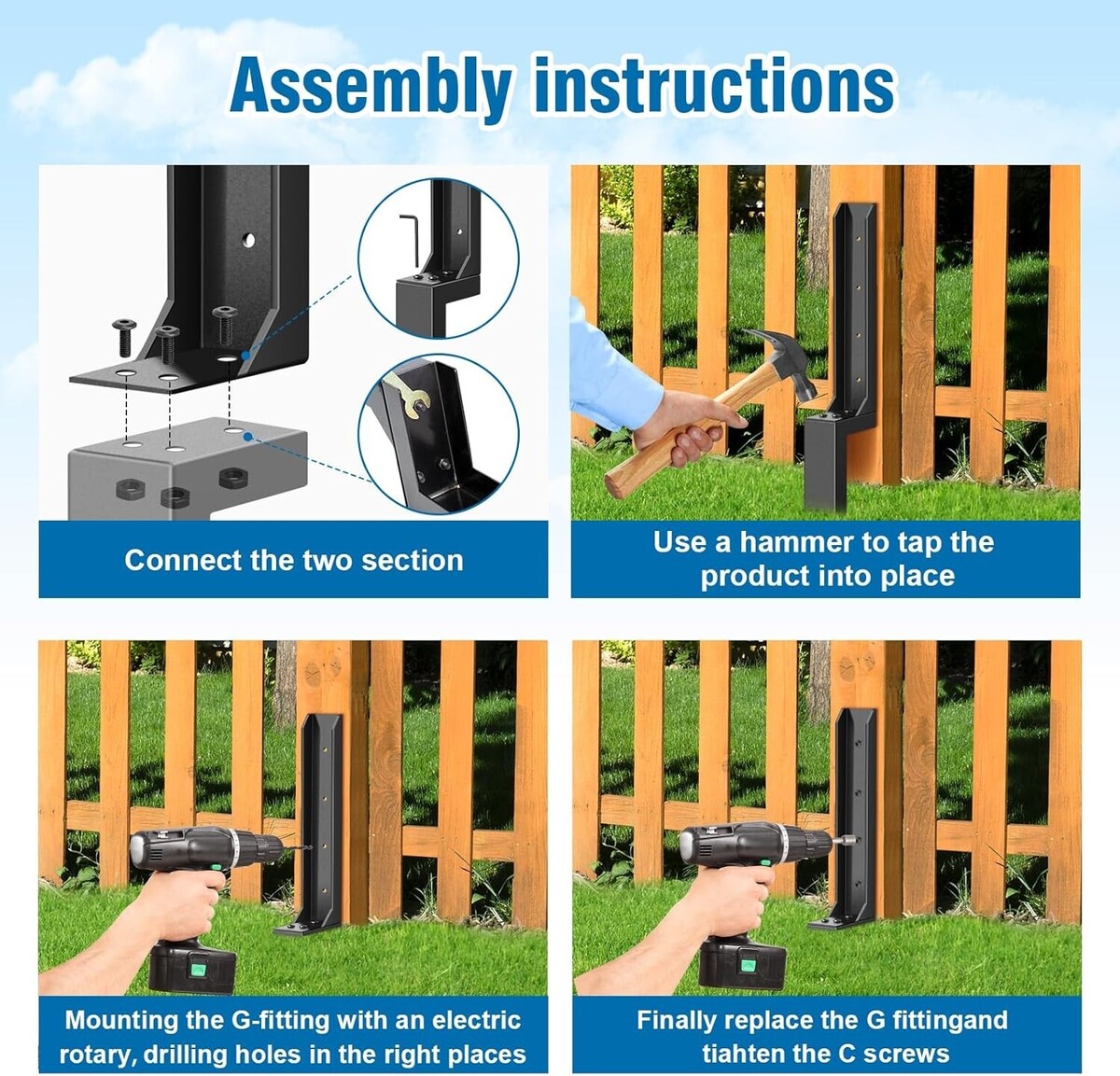 Installation Steps : Connect the two parts together, use a hammer to drive the repair pile into the soil, and fix the repair bracket to the wooden fence by tightening the screws. If the screws are loose, please tighten them again
