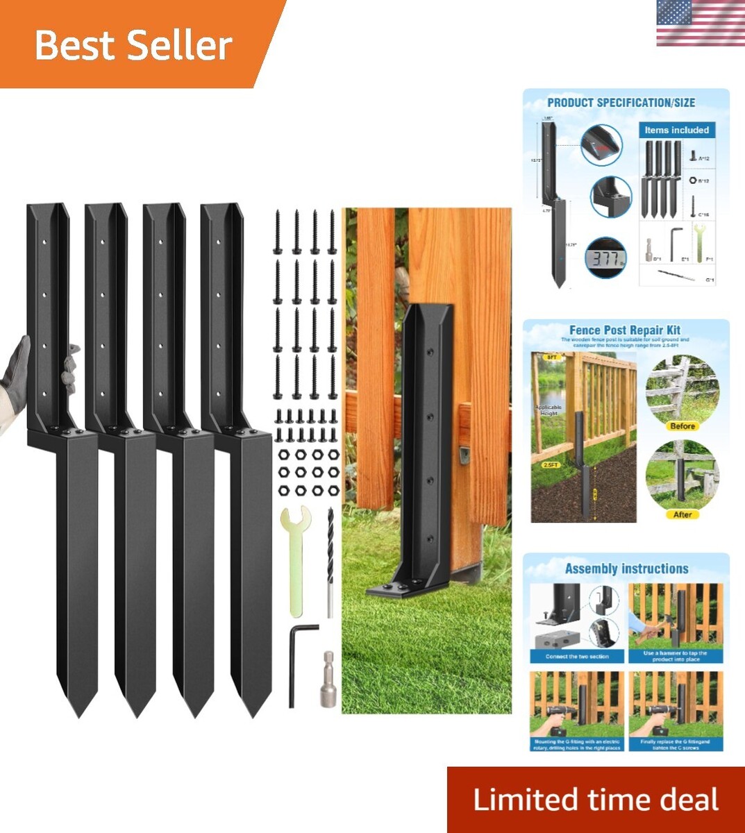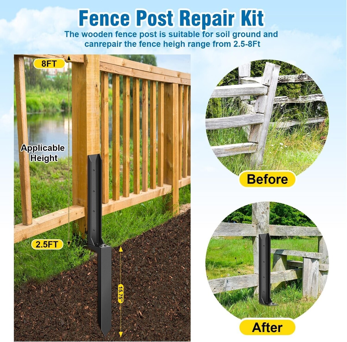 Fence Post Repair Kit Our fence repair anchor kit is designed with strong repair function and made of high quality heavy steel to prevent the fence from tipping over even in bad weather, effectively extending the service life of the restoring your fence, mailbox, deck flagpole trellis, and other wood post construction easy, time-saving, and a huge savings for you. We are dedicated to designing easy-to-install and practical fence repair stake to provide you with the perfect solution.