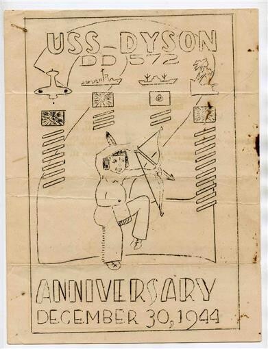 A 6 page stapled USS Dyson DD 572 Anniversary Publication, dated December 30, 1945 . Has interesting cover showing planes, military ships, civilians ships and land battles, list of commanding officers from December 1942 to September 1944, A Program, Crew List with commissioning rate and present rate, list of operations , engagements, and campaigns participated in by U S S Dyson, and Banquet Menu. Measures about 8 1/2' x 11'. This is an original. The Dyson had a distinguished fighting carrier in the Pacific