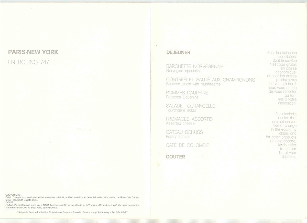 An interesting 4 page Air France Menu from a flight from Paris to New York on a Boeing 747 in 1977. A Dejuener Menu in French and English. In very fine condition.. Measures about 6 " x 8 1/4" when closed. On the front cover is portion of a photograph taken by a NASA Landsat satellite from an altitude of 570 Miles. On the back cover is a map of the are shown on the front cover. This menu cover shows New York City area