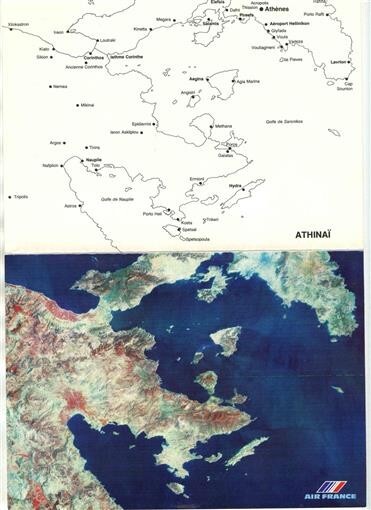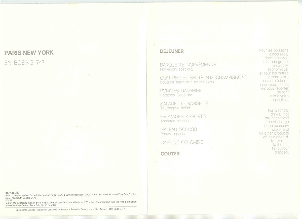 An interesting 4 page Air France Menu from a flight from Paris to New York on a Boeing 747 in 1977. A Dejuener Menu in French and English. In very fine condition.. Measures about 6 " x 8 1/4" when closed. On the front cover is portion of a photograph taken by a NASA Landsat satellite from an altitude of 570 Miles. On the back cover is a map of the are shown on the front cover. This menu cover shows Athens Greece