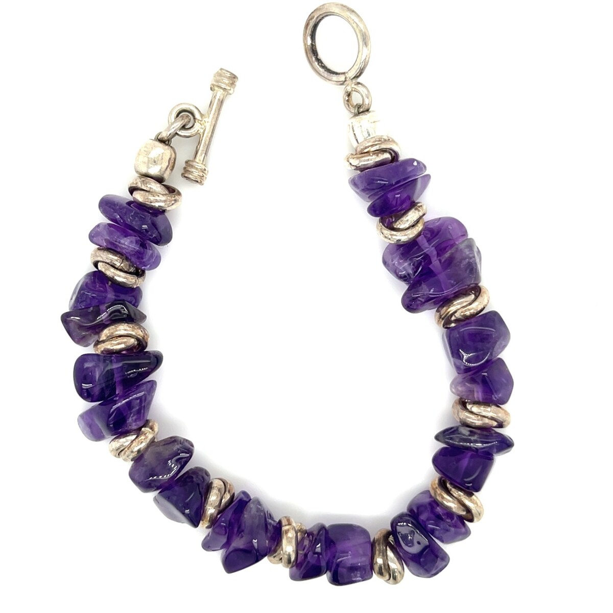 Gorgeous Bracelet Featuring nicely tumbled Amethyst Stones accented with two sterling ring spacers All shipments include insurance and delivery confirmation or signature confirmation. Local Pick-up is available in our showroom. All international packages will have the required customs declaration and value of order. Your continuing satisfaction is very important to us. We offer a 30 day money back return policy. If you are unhappy with your purchase for any reason, please notify us so that we can begin the returns process. All items for sale are available for viewing at our Southern California showroom. We would like to thank all of our loyal customers for their continued support. If you have any questions, comments or concerns, please click "Ask a question" below, and we will respond a