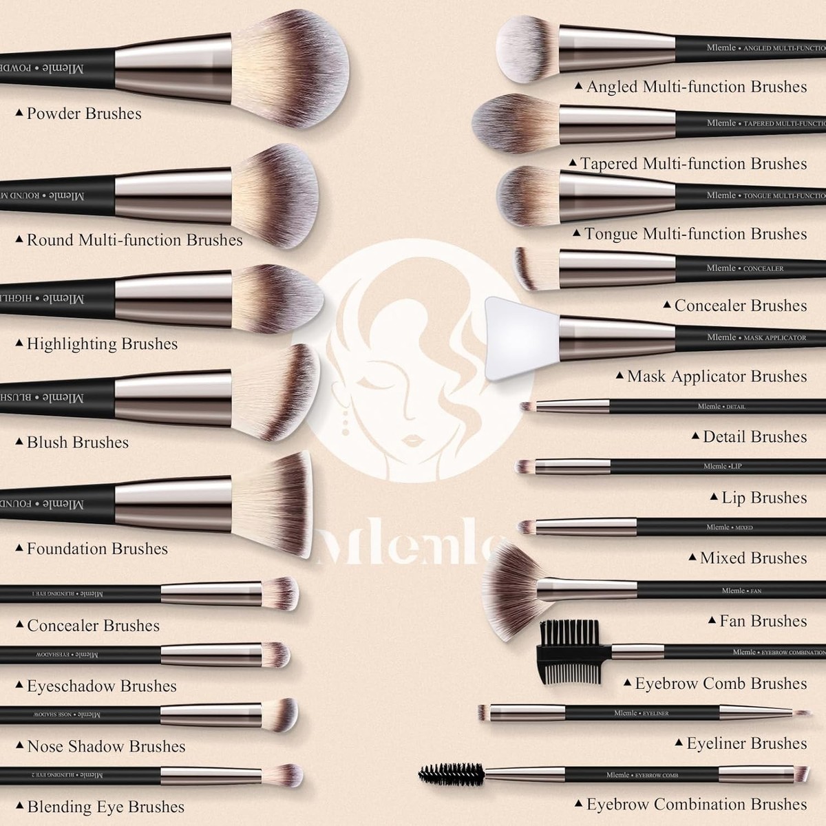 This is the best makeup brush set! Each individual brush is labeled with what type of brush it is. For example, blush, foundation, overall eyeshadow brush, blending brush, etc. which is very helpful to individuals who are learning proper application techniques. The bristles are so soft against your skin and glides smoothly over your skin. This set comes with an individual box containing brushes that are only used on the face and another box for all brushes used for the application of eye makeup. It also contains (3) different sized blender sponges. I also like the length of the brushes which help in the ease of applying makeup properly.