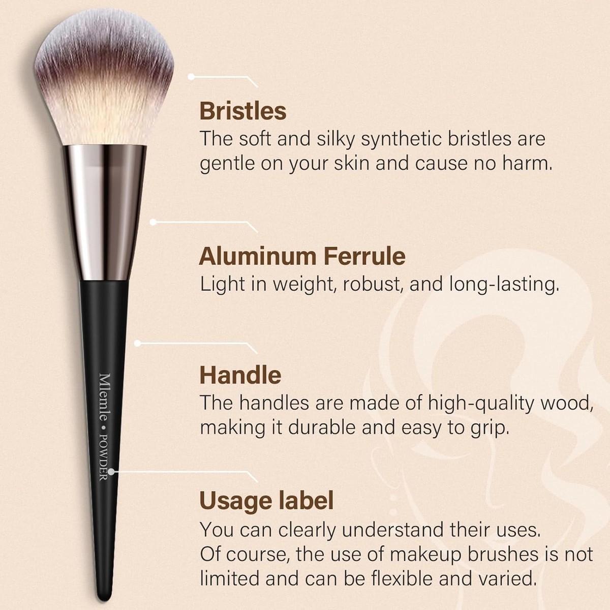 The brushes are made with soft, high-quality synthetic fibers (nylon), which are gentle on sensitive skin and offer excellent powder retention for a flawless application. They are durable and long-lasting.
