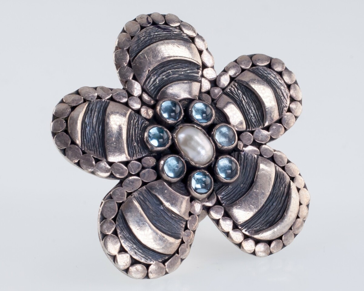 Features Floral Plaque Set with Seven Small Blue Topaz Cabochons and Mother-of-Pearl Center