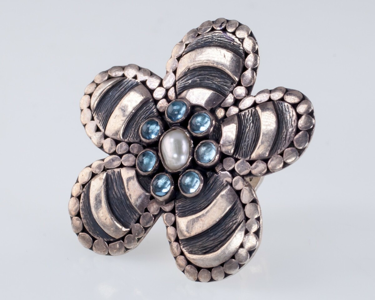 Rane Sterling Silver Antiqued Flower Ring with Blue Topaz Accents Size 5.75