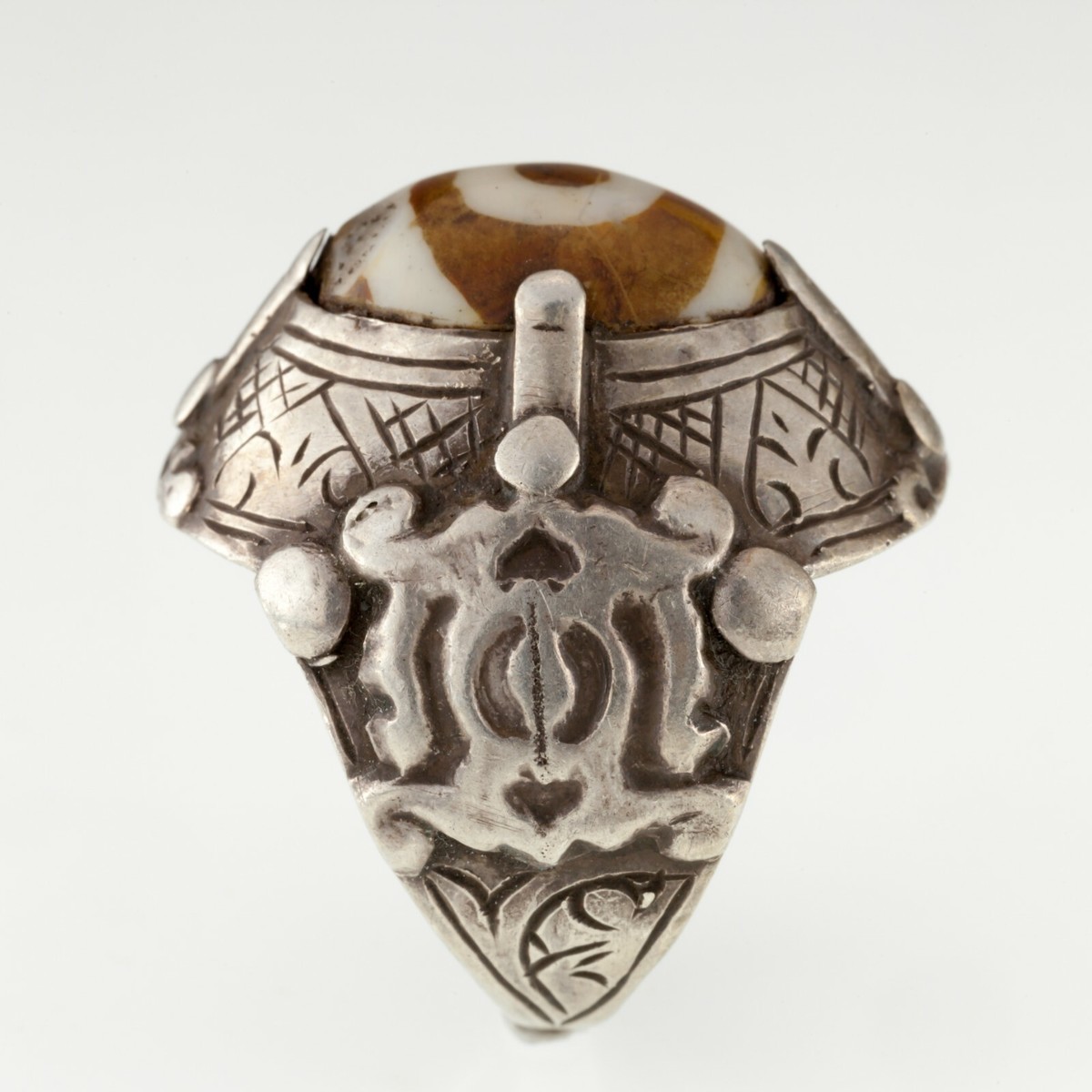 Silver Afghan Hand-Chased Plaque Ring with Bullseye Agate Size 5.5