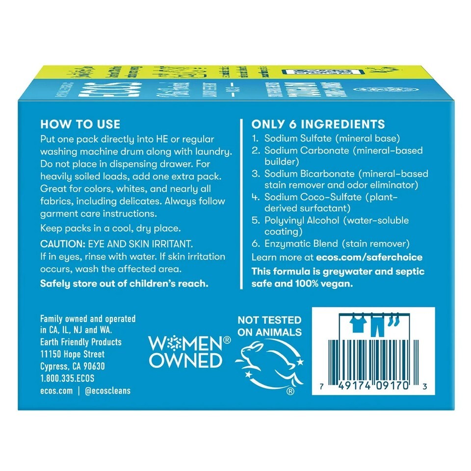 The formulation is greywater and septic safe, helping keep our planet and waterways clean. ECOS Laundry Packs are Made in the USA with globally sourced ingredients in a climate-positive facility and are Leaping Bunny certified (never tested on animals).