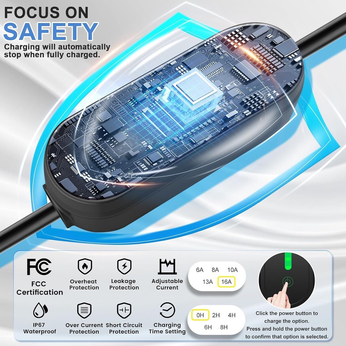 ?Advanced Features?5 gears of 6A, 8A, 10A, 13A and 16A for you to choose. For safety, the current gear can only be changed before charging. It also has a timed charging function. You can choose to start charging after 2 hours, 4 hours, 6 hours and 8 hours. When set to 0H, the ev charger will immediately start charging. After being fully charged, it will automatically stop charging. The 25ft cable is enough to meet the needs of most places.