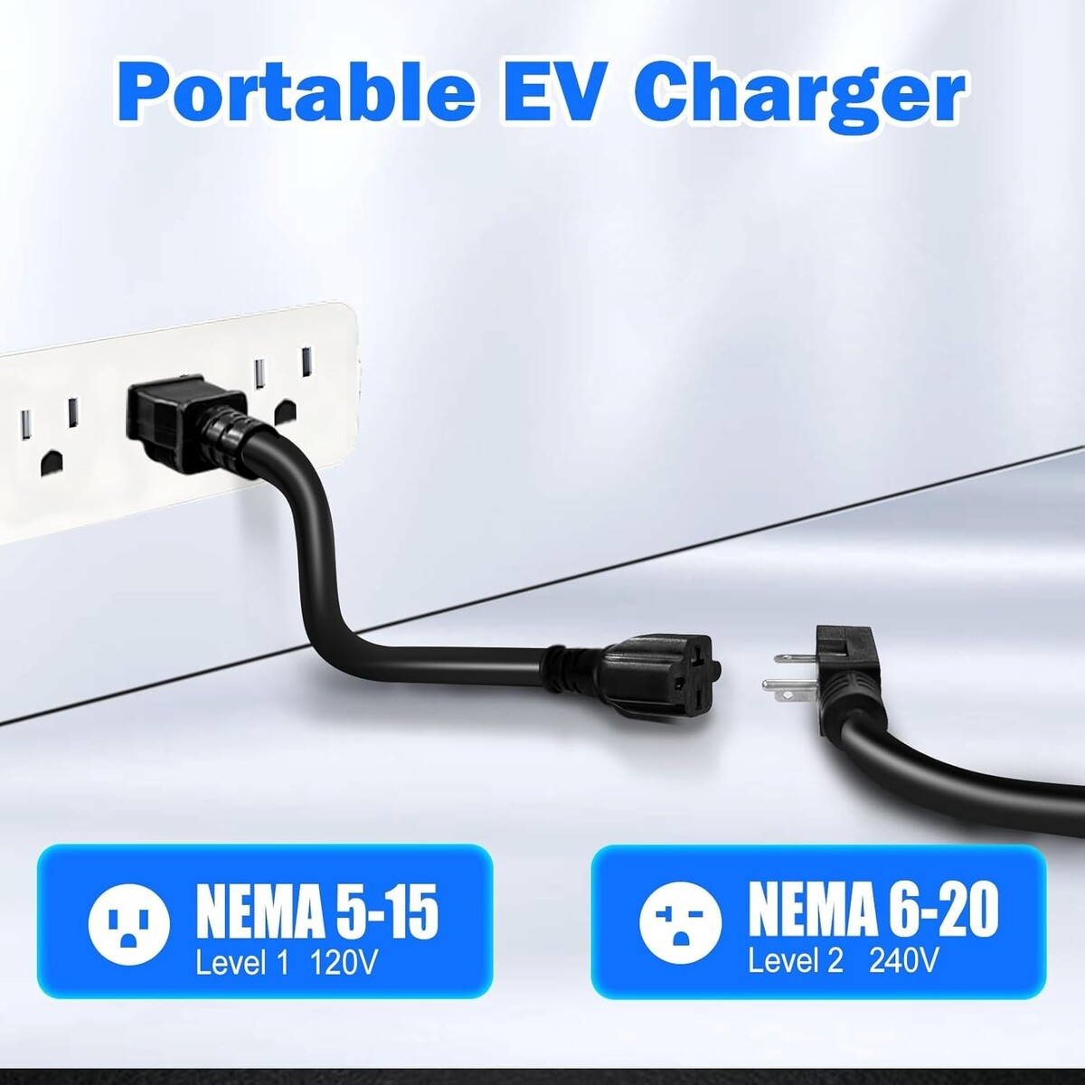 ?Fit 5-15 Sockets and 6-20 Sockets?This EV charger features a standard NEMA 6-20 Plug (Level 2 circuits, 240V, 16A) power cord. If you need to use this charger on 5-15 socket, please use the additional NEMA 5-15 adapters (Level 1 circuits, 120V, 13A). It's recommended to use a 20A circuit breaker, and the max gear on 5-15 socket is 13A.