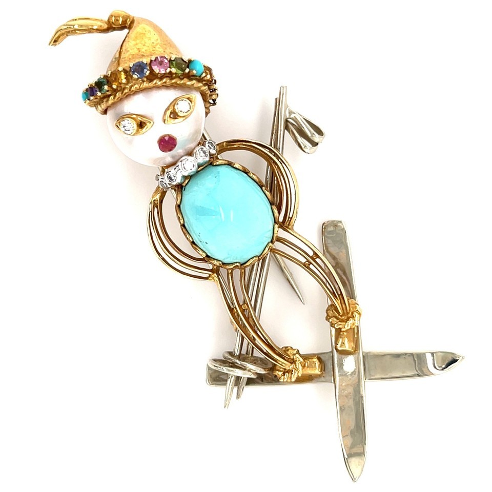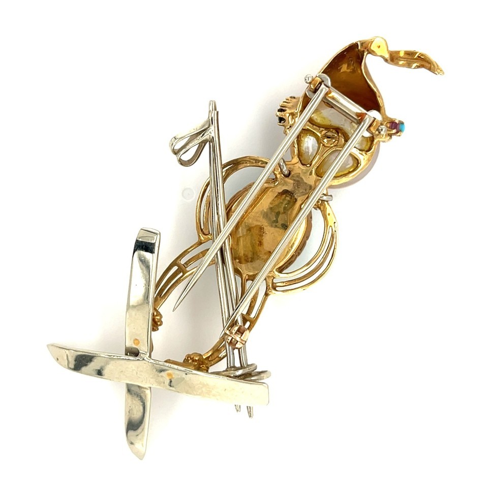 18k Yellow Gold Multi-Gem Figural Skiier Brooch Vintage!