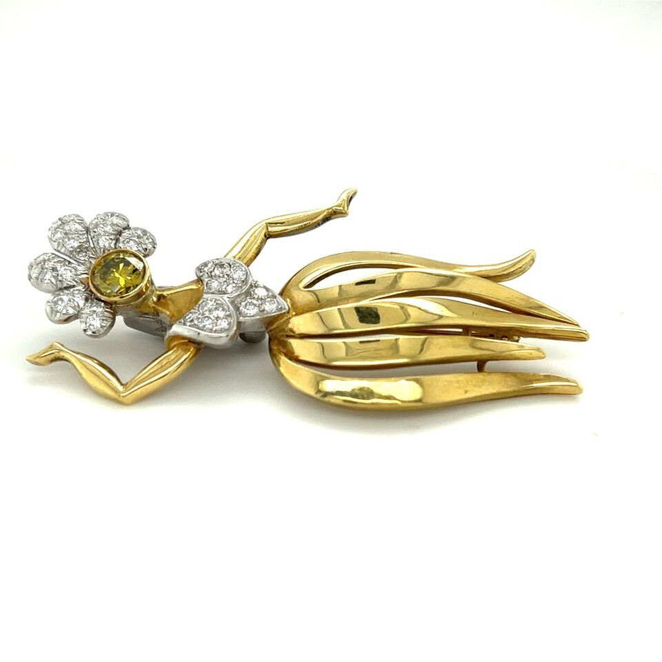 18k Two-Tone Gold Vintage Hula Dancer Brooch w/ Irradiated Diamond