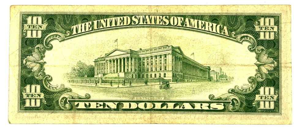 Condition Notes: Very Fine+ Condition. Even margins. Edges are sharp with minor creases. One vertical and one horizontal fold. Creases and fold lines all over the bill. No tears. Normal discoloration and yellowing from age and use. Staining on both sides of the bill. Blue-colored graffiti on the obverse to the left of the portrait. Overall, good condition, with normal signs of aging and wear.