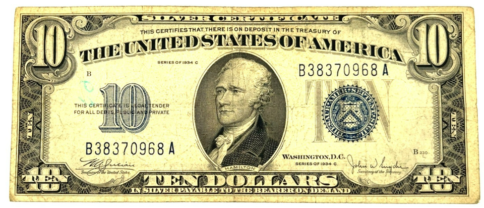 Series of 1934-C $10 Silver Certificate FR #1704 Very Fine+ VF+ Condition