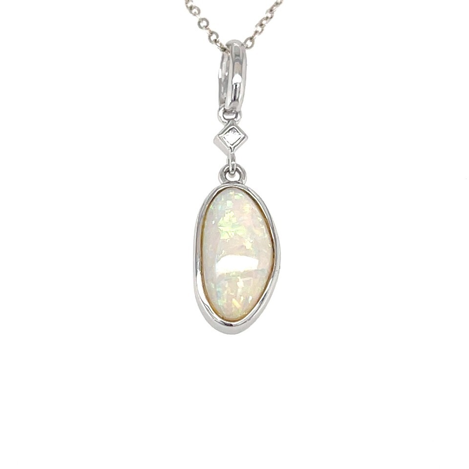 18K White Gold Natural Opal Cabochon Pendant w/ Diamnond Accent