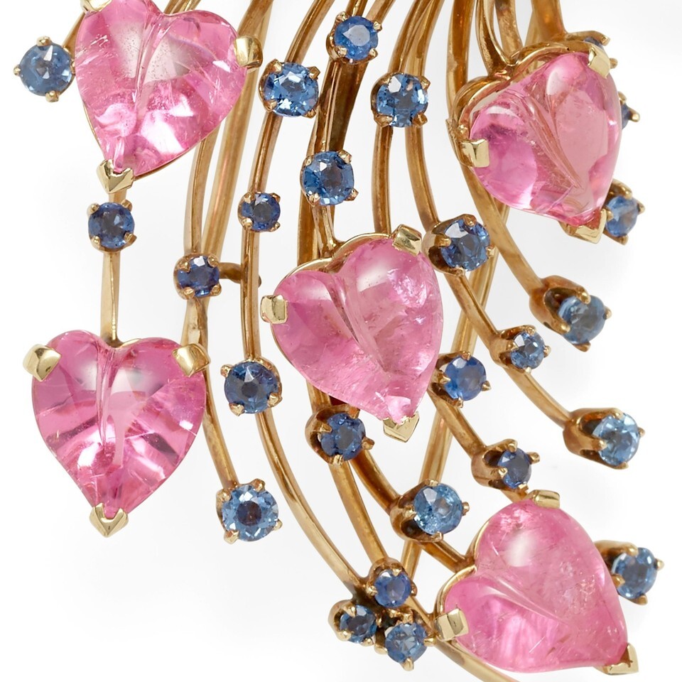 Style/Design: Cascading branch design made of yellow gold, sprayed with polished heart-shaped pink tourmalines and interspersed with vibrant round sapphires.