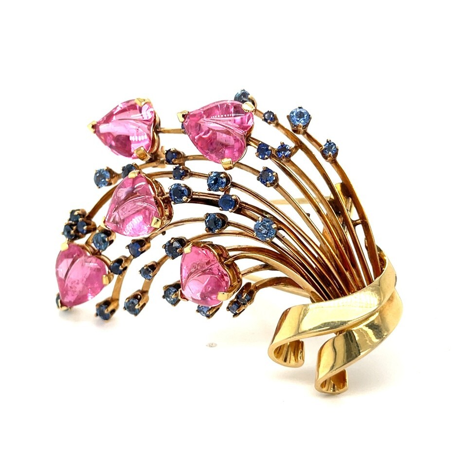 14k Yellow Gold Trabert and Hoeffer-Mauboussin Brouch w/ Pink Heart Tourmalines and 2.95 CT Sapphires #5528 38.9 Grams
