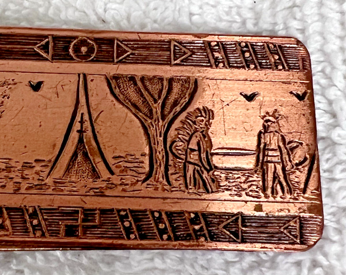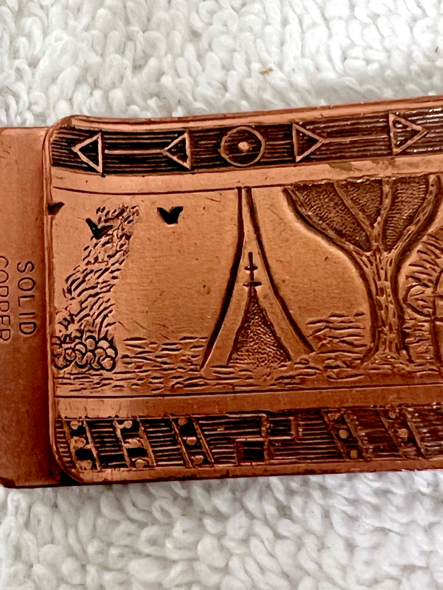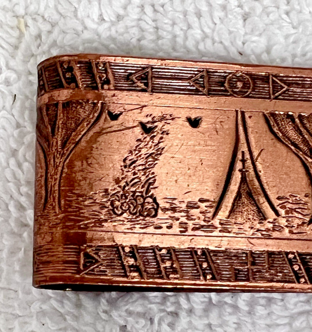 Solid Copper Money Clip Teepee Canoe Arrows Native American Indians Embossed Pattern 2" Long. Approx. 2" money clip is in very good condition, pattern clear, no damage. See pictures.