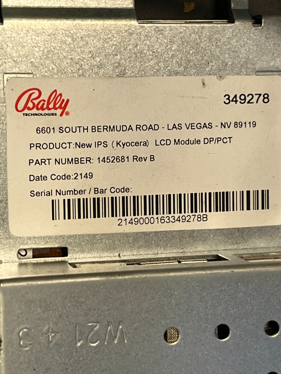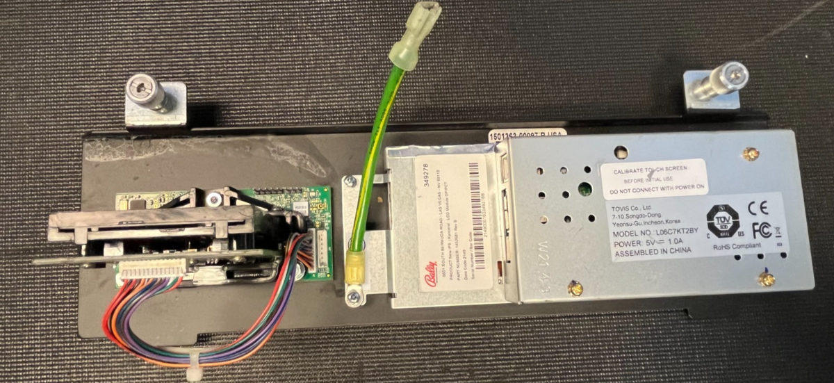Bally Technologies IPS LCD Module for DP/PCT Player Tracking with Tovis L06C7KT2BY 6.2" touchscreen display and integrated card reader, pulled from a working slot machine. This iView 4.0 style assembly includes the LCD screen, touch panel, card reader mechanism, mounting brackets, wiring harnesses (including green power wire), and PCB?exactly as pictured. Shows typical casino use wear like light dust, scratches on housing, and label wear, but no obvious broken screens or mechanisms.