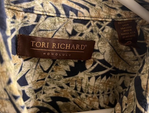 Tori Richard Shirt Men's Large Blue Green Tan Leaves Hawaiian Honolulu Cotton