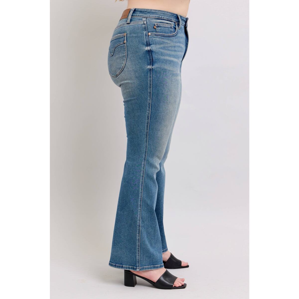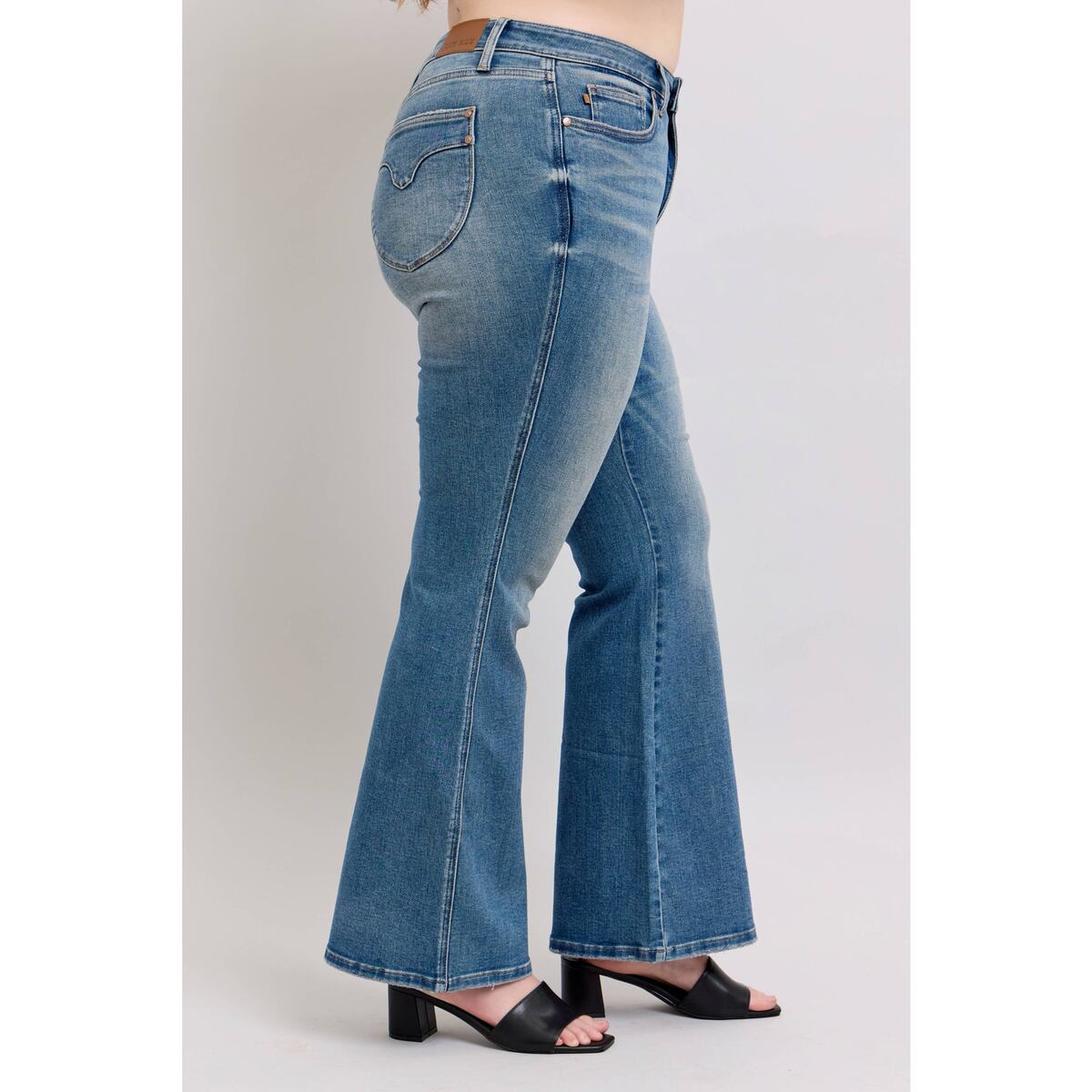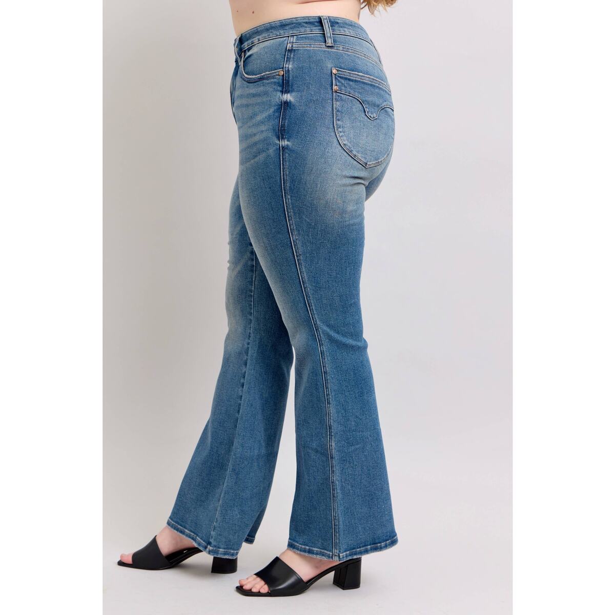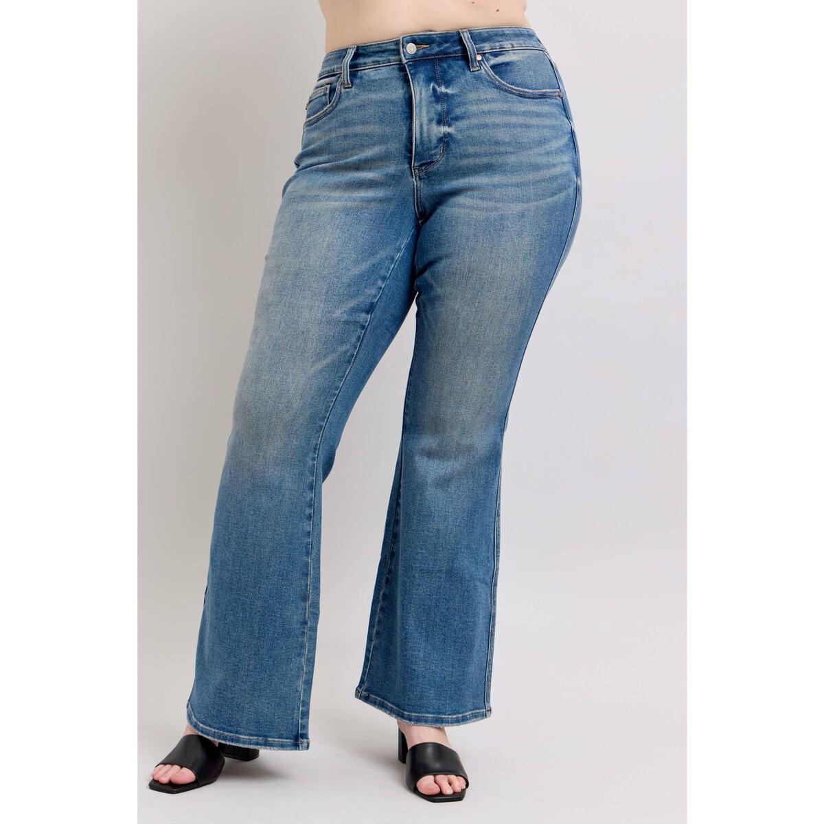 Step into timeless style with these premium mid-rise flare jeans featuring advanced tummy control technology. The vintage wash adds character and versatility to your wardrobe, while the flattering flare silhouette elongates your legs for a confident, retro-inspired look.