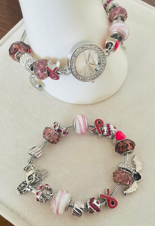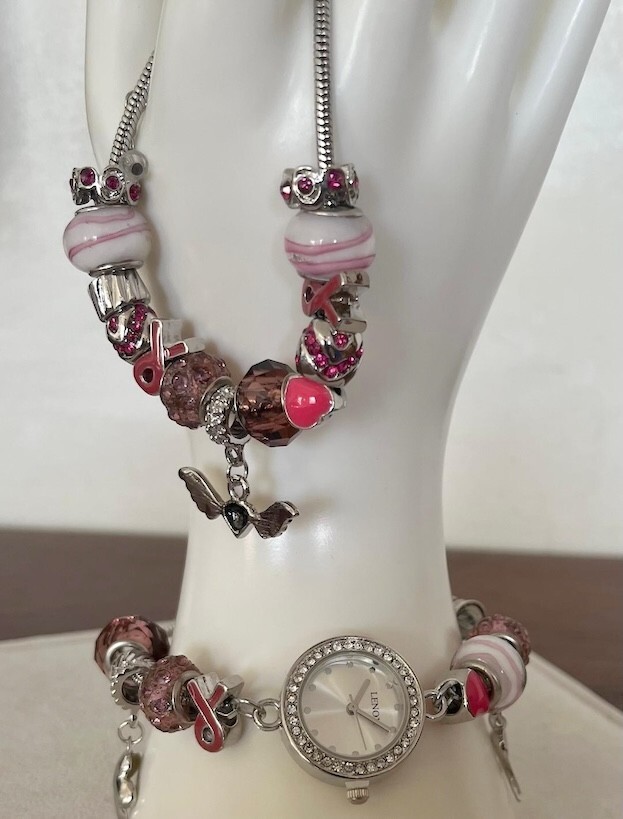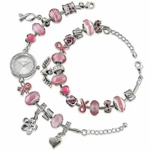 Lenox Watch & Bracelet 2-PC. Set Gift of Knowledge Pink Crystal/Beads/Charms New