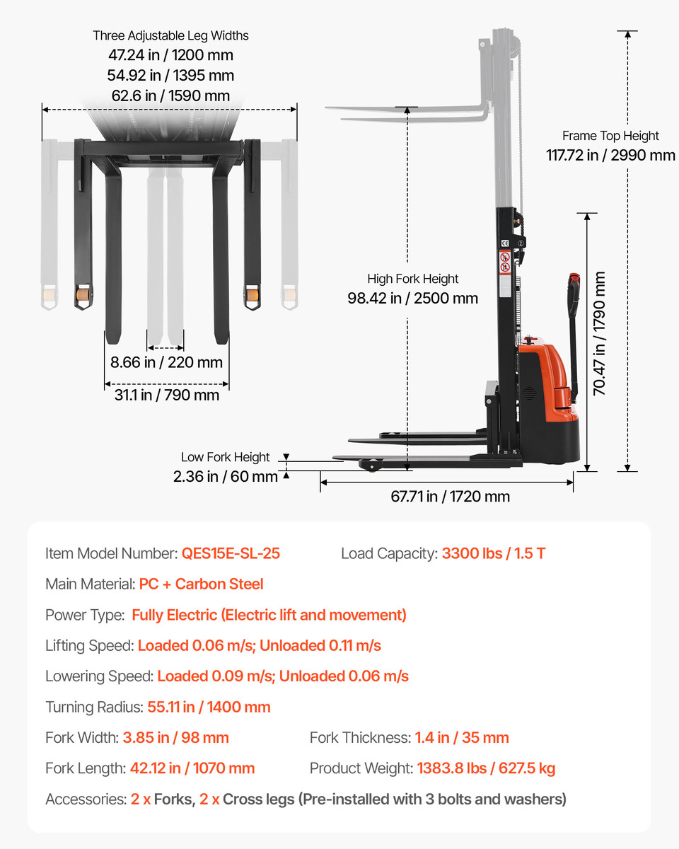 Adjustable for Flexibility: Our stacker forklift easily fits into tight spaces with adjustable fork width (8.66-31.1 inches), leg width (3-step adjustable), and mast height (70.47 - 117.72 inches). Ideal for various pallet sizes and stacking needs