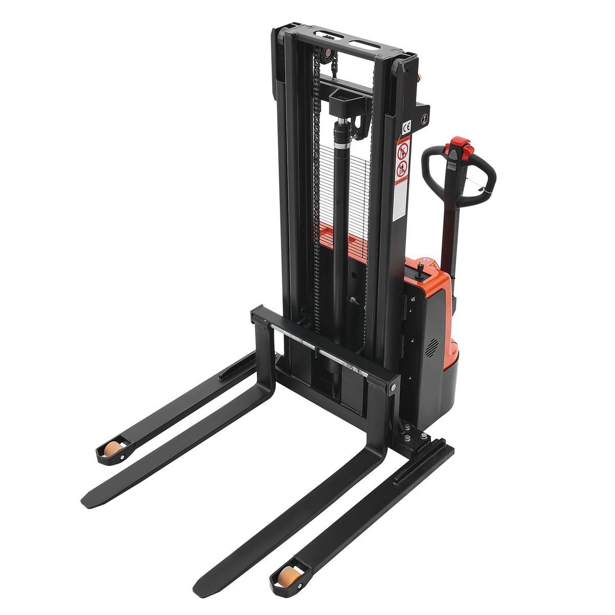 Powerful Performance: Our fully electric pallet stacker is built from high-strength carbon steel and can carry up to 3300 lbs! The 2.2KW motor smoothly lifts forks from 2.36 to 98.42 inches for quick and efficient stacking