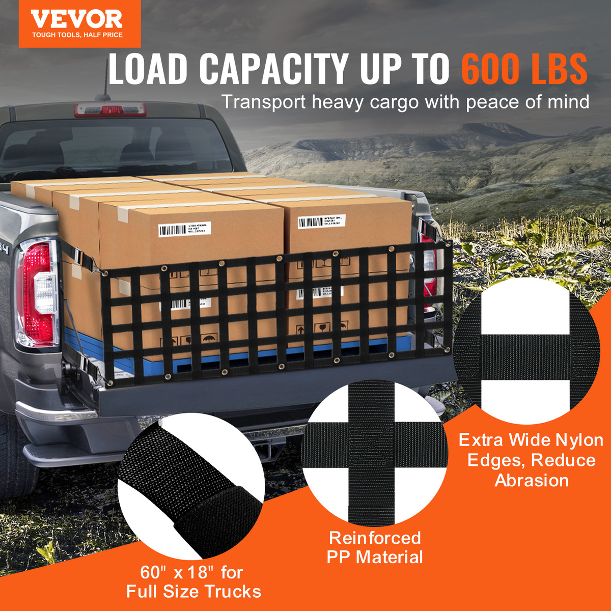 Load Capacity Up to 600 lbs: Our 60"x 18" tailgate net uses heavy industrial reinforced PP material to ensure its load-bearing capacity. Furthermore, the ultra-wide nylon edge reduces tensile wear caused by long-term use. So our truck tailgate net is more suitable for full-size trucks and is great for transporting large or extra-long cargos like kayaks, motorcycles, wood, construction materials, etc.