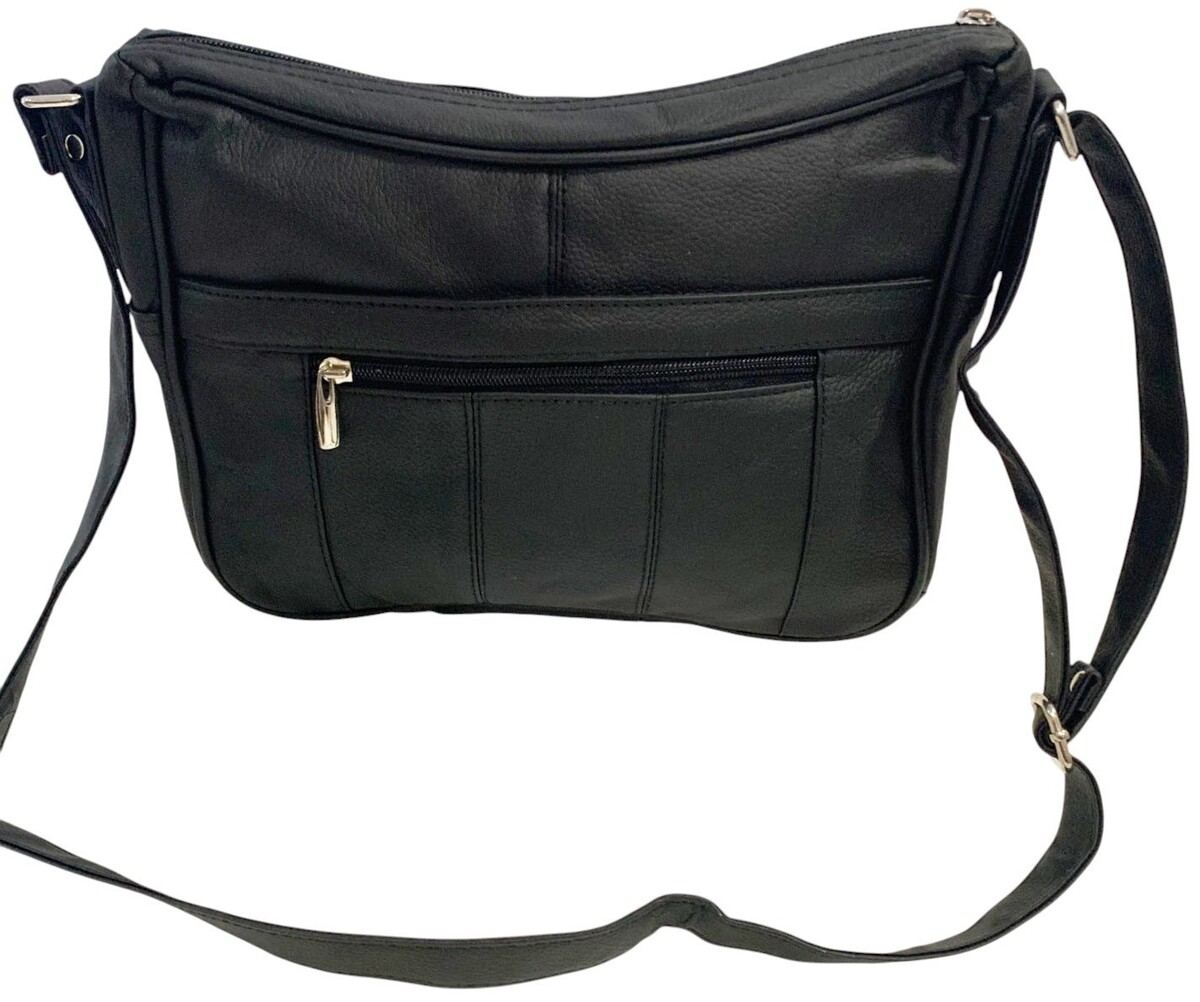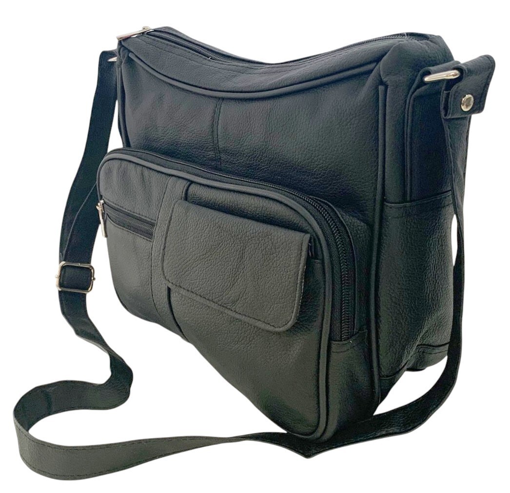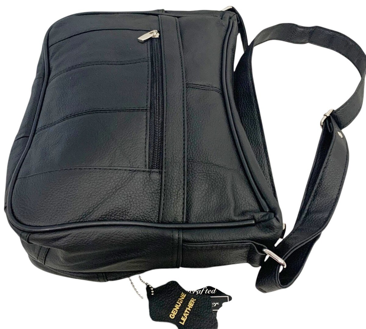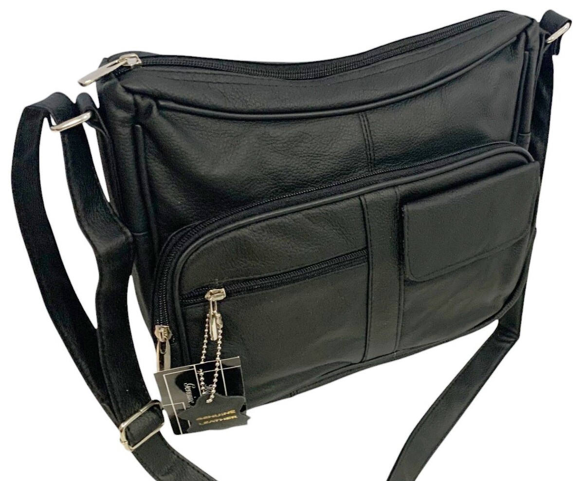 BLACK COWHIDE Leather Organizer Shoulder Bag Multiple Pockets Cross Body Handbag