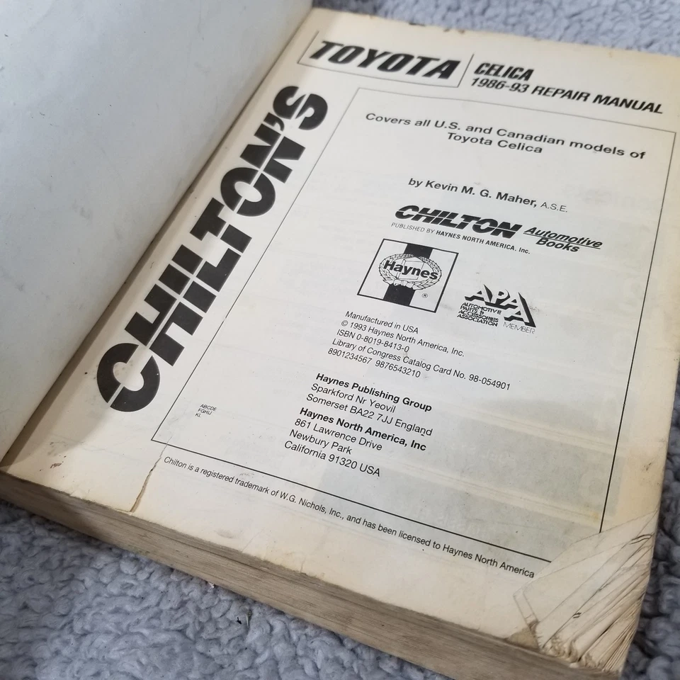 The product is a 1986-1993 Toyota Celica Chilton's Total Car Care Repair Manual Service manual. This original manual published by Chilton in 1993 is a comprehensive guide for service and repair of Toyota Celica vehicles. Made in the United States, this paper manual provides detailed instructions and diagrams to help with maintenance and troubleshooting of the Toyota Celica model from 1986 to 1993. Perfect for car enthusiasts and mechanics looking to keep their vehicle in top condition.
