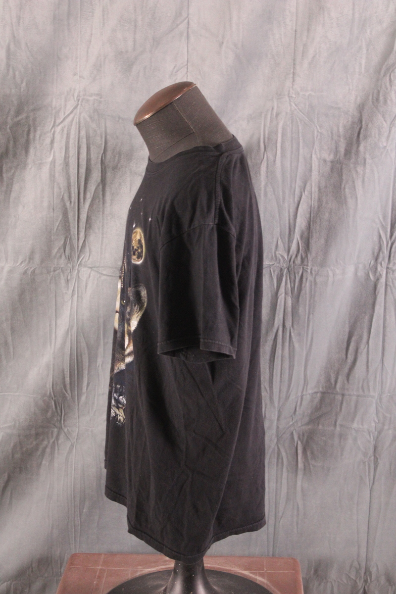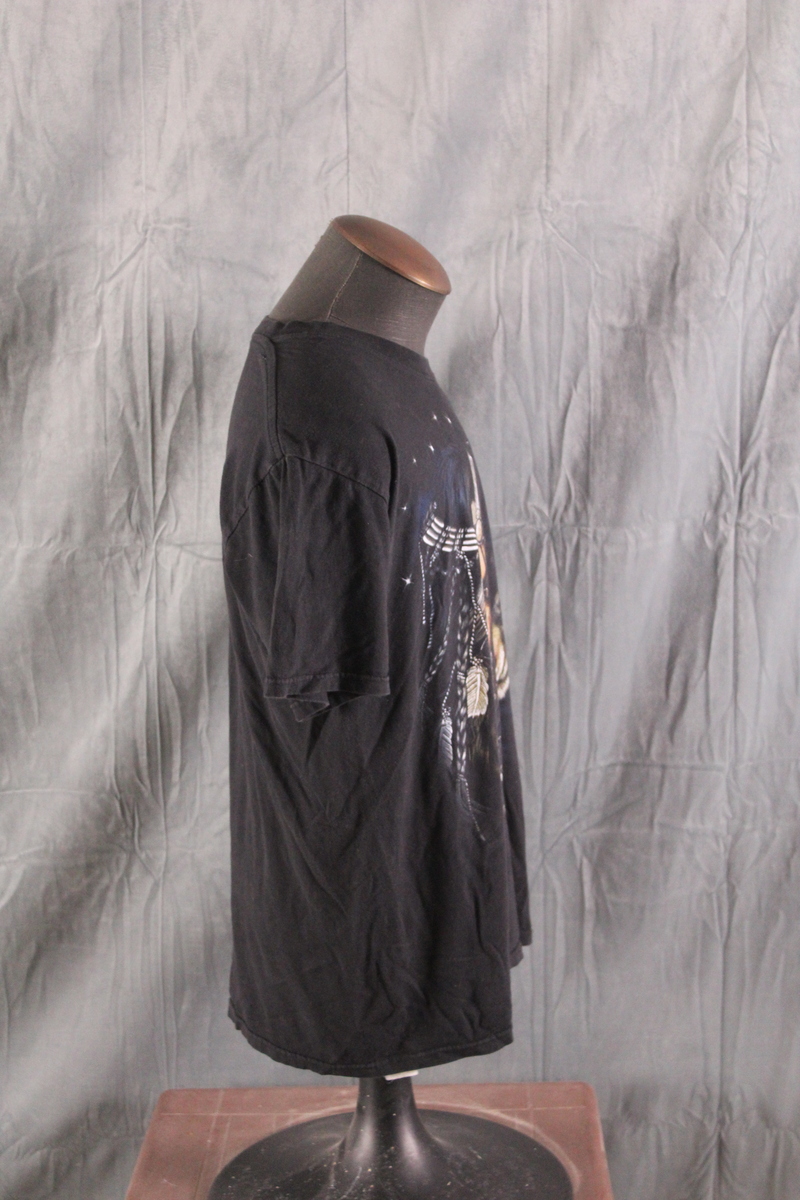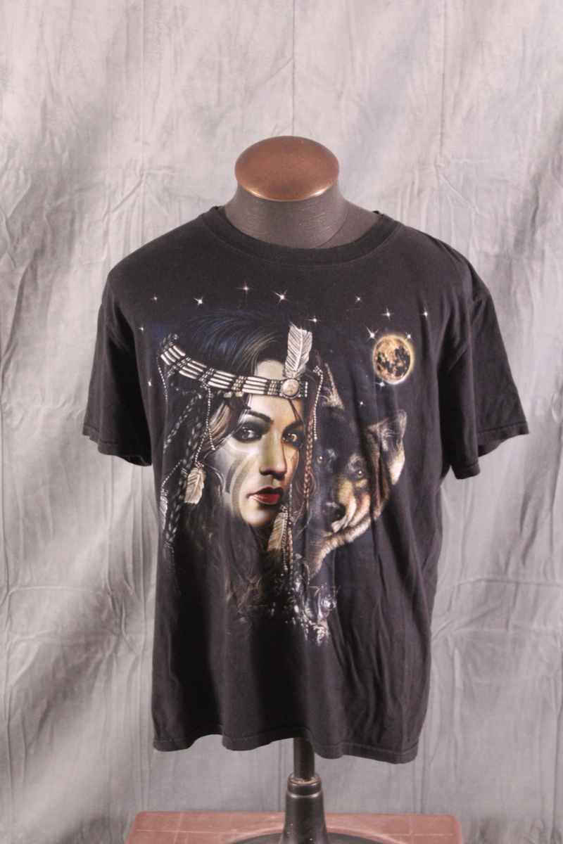 Up for sale is a vintage graphic t-shirt. It has a black base colour with a large graphic of a Native lady's head beside a wolf head on a star background screened on the chest. It is a big graphic shirt. What a great shirt do not miss out on it.