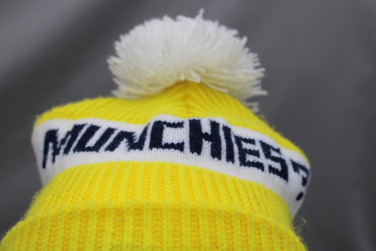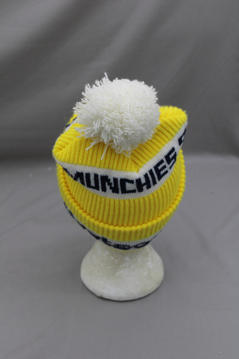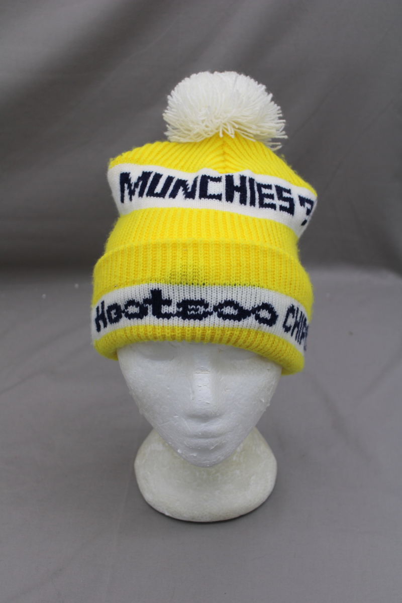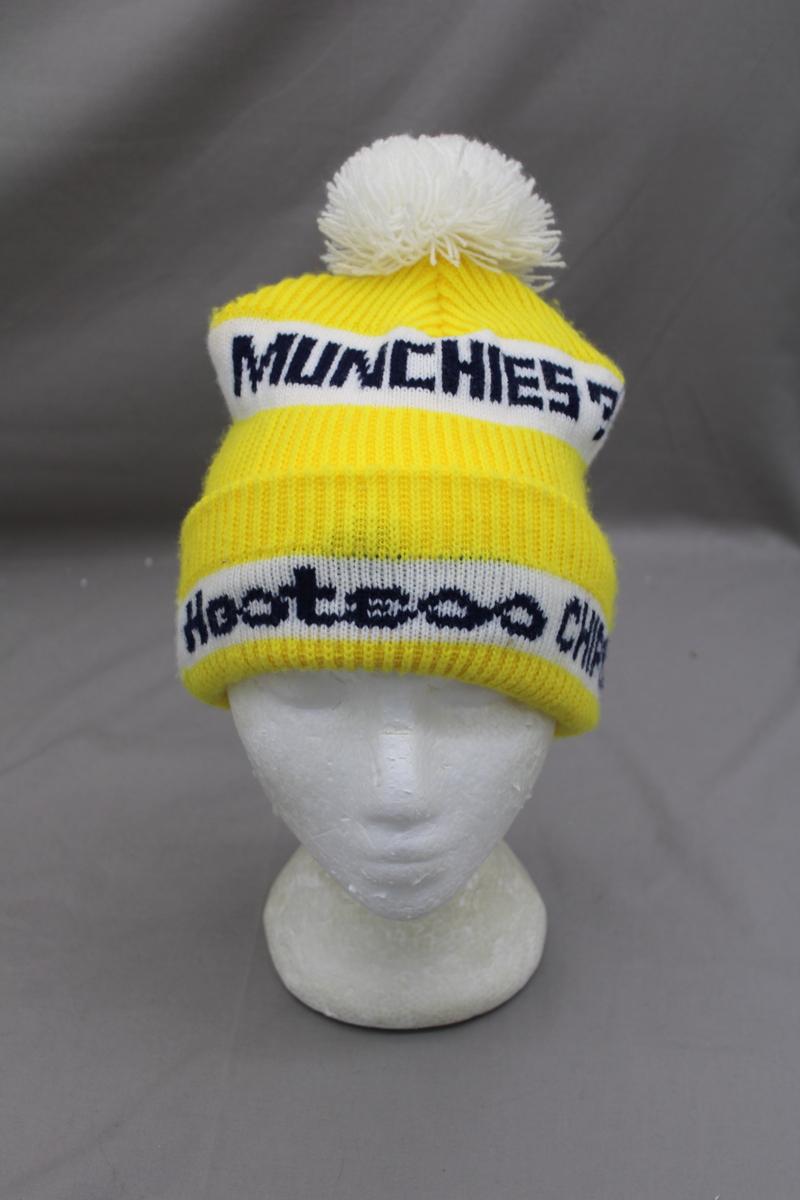 Up for sale is a vitnage toque. It has a yellow base colour with white trim. The upper portion of the toque has Munchies woven in twice wrapping around the tqoue. The roll up portion of the toque has Hostess Chips woven in wrapping around the toque. What a great toque do not miss out on it.