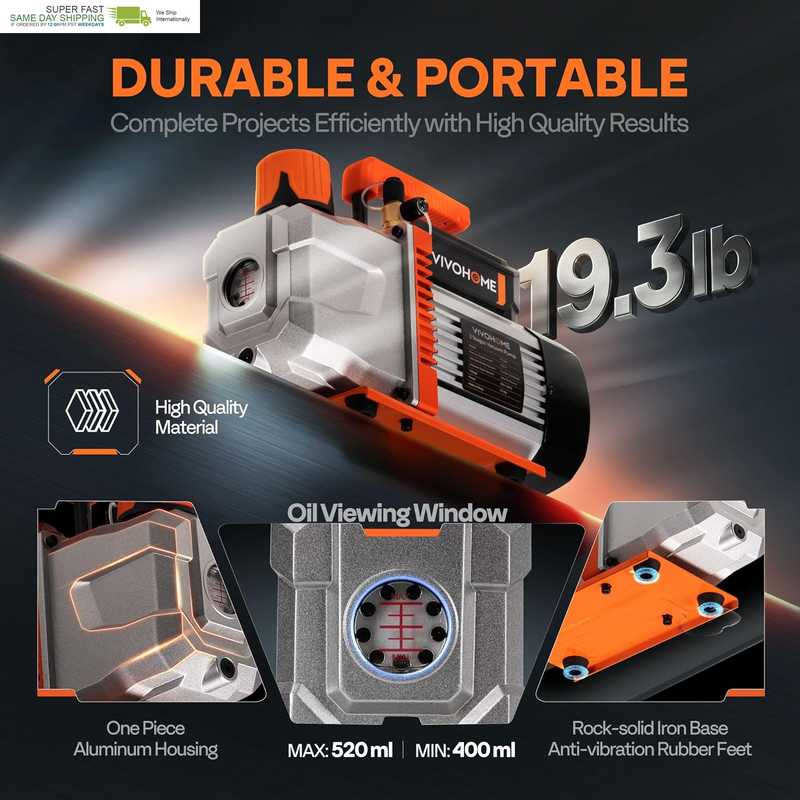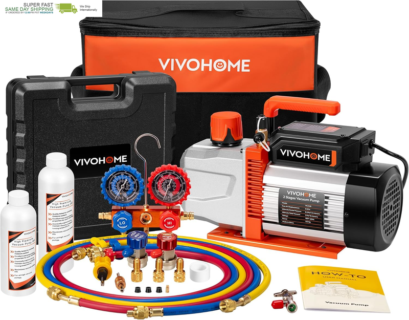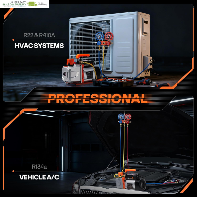 ONE KIT FOR PROS DIYERS: The AC vacuum pump kit handles any job from home and commercial A/C systems (R22/R410A) to automotive repairs (R134a); A go-to solution for on-site servicing, mobile repairs, and routine HVAC maintenance