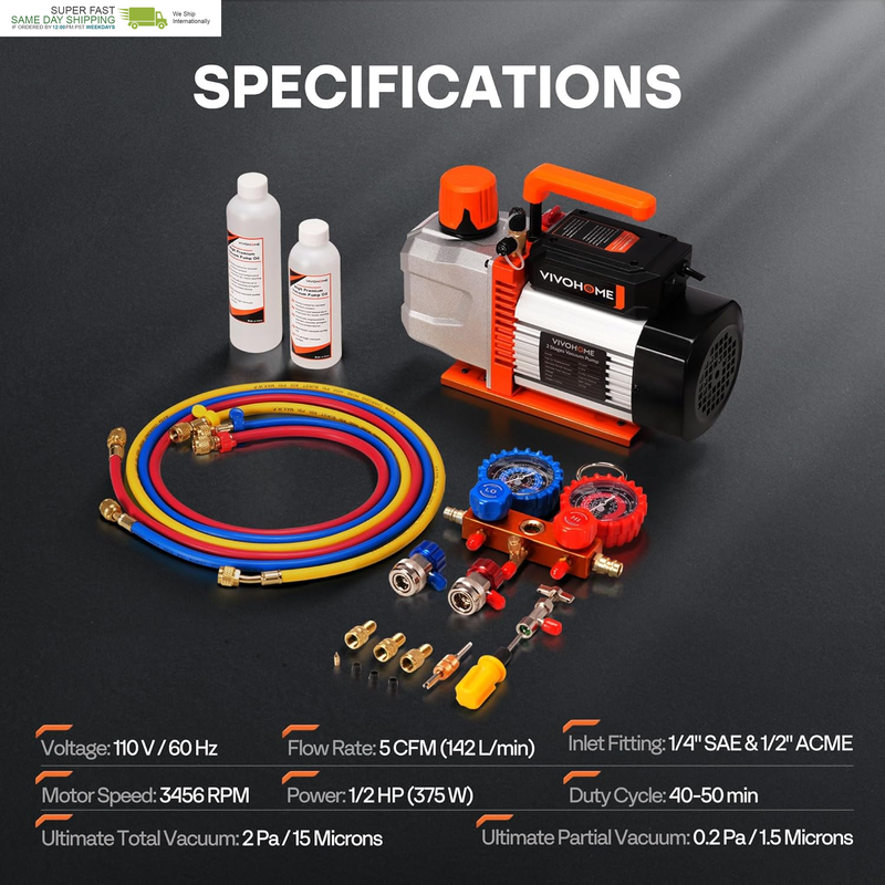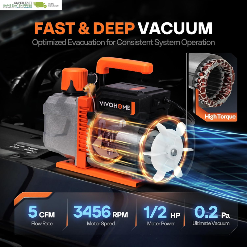 DEEP VACUUM FAST AIR REMOVAL: The VIVOHOME 1/2 HP dual-stage vacuum pump reaches a 15-micron vacuum quickly; 5 CFM flow and 3456 RPM high-torque copper motor ensure fast air removal, helping reduce ice buildup in HVAC and automotive A/C system