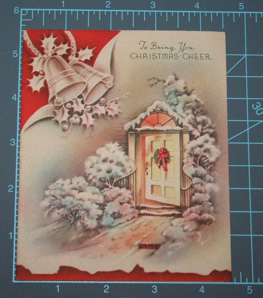 VINTAGE 1940s WWII ERA Christmas Greeting Holiday Card SILVER BELLS Wreath Door