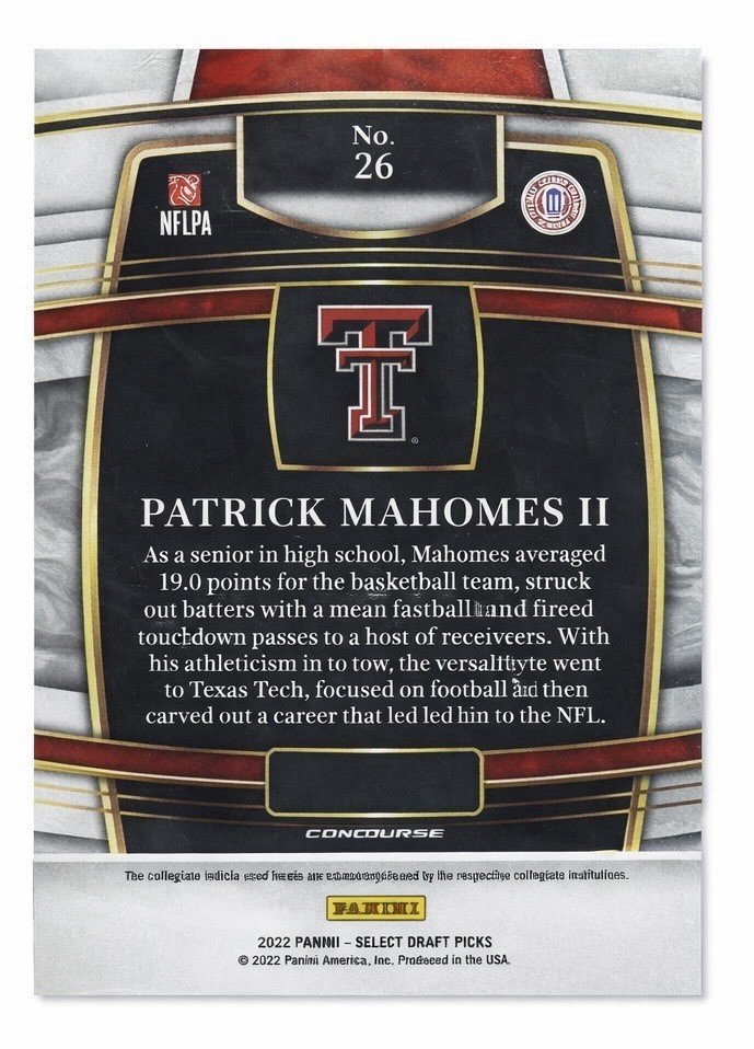 Patrick Mahomes II, 2022 Panini Select Draft Picks, #26 Texas Tech NFL KC Chiefs