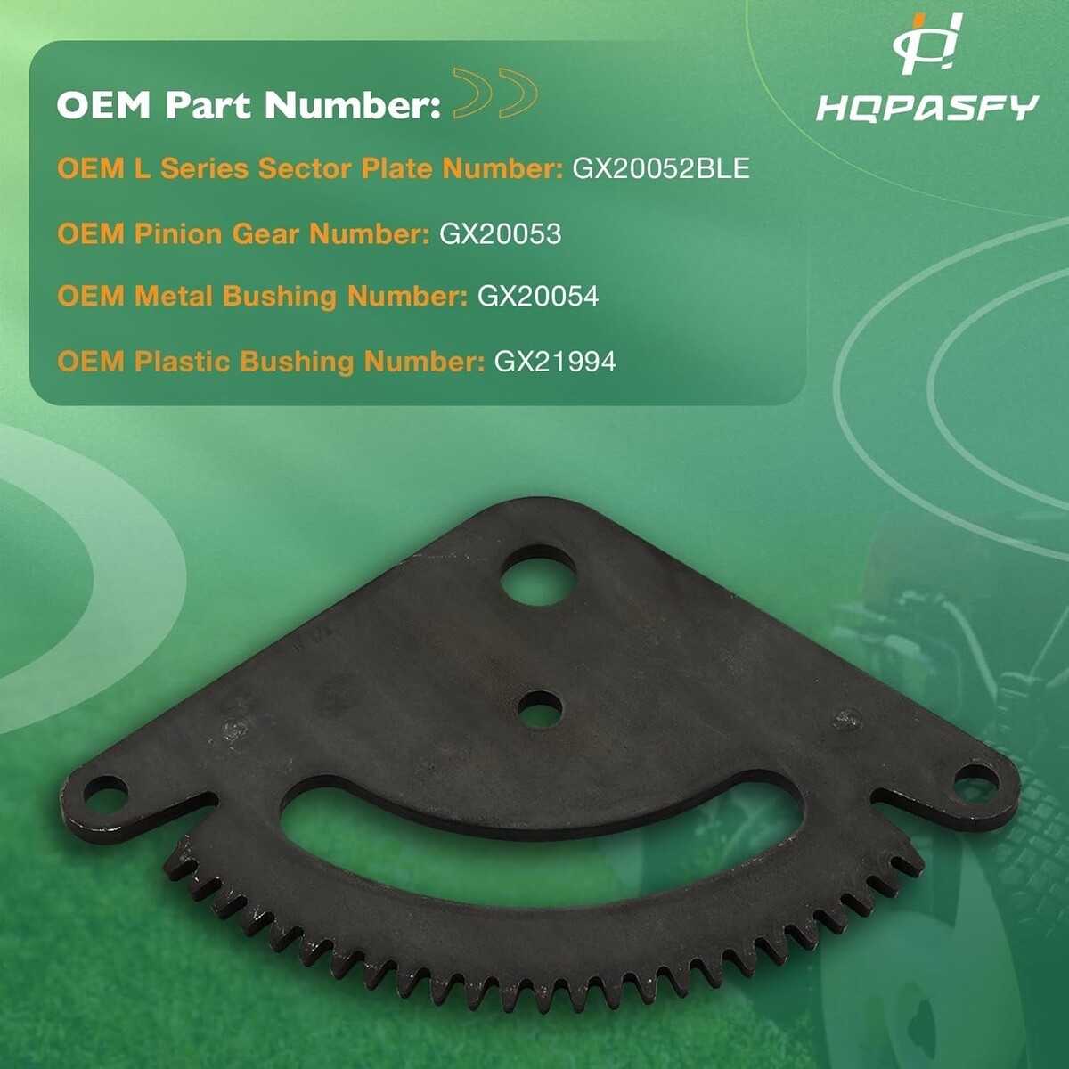 ?REPLACES#?OEM L Series Sector Plate Number: GX20052BLE. OEM Pinion Gear Number: GX20053. OEM Metal Bushing Number: GX20054. OEM Plastic Bushing Number: GX21994. Please verify your model is listed in the fitment section